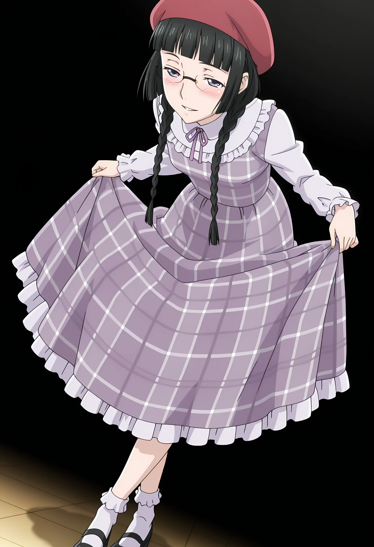 1girl, ruri, long hair, black hair, bangs, blunt bangs, braid, twin braids, purple eyes, glasses, small breasts