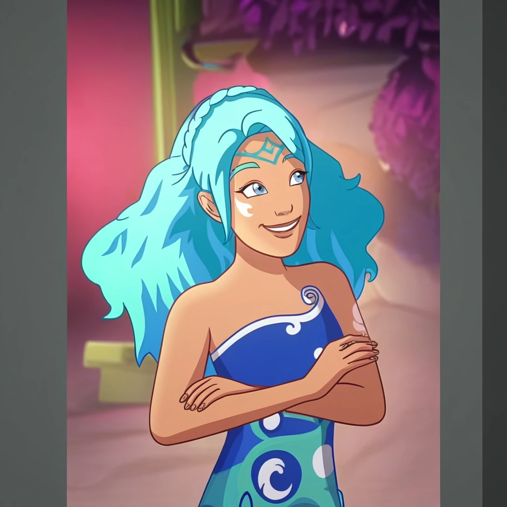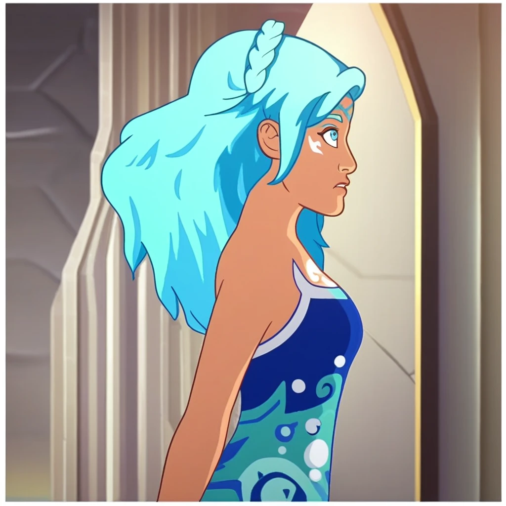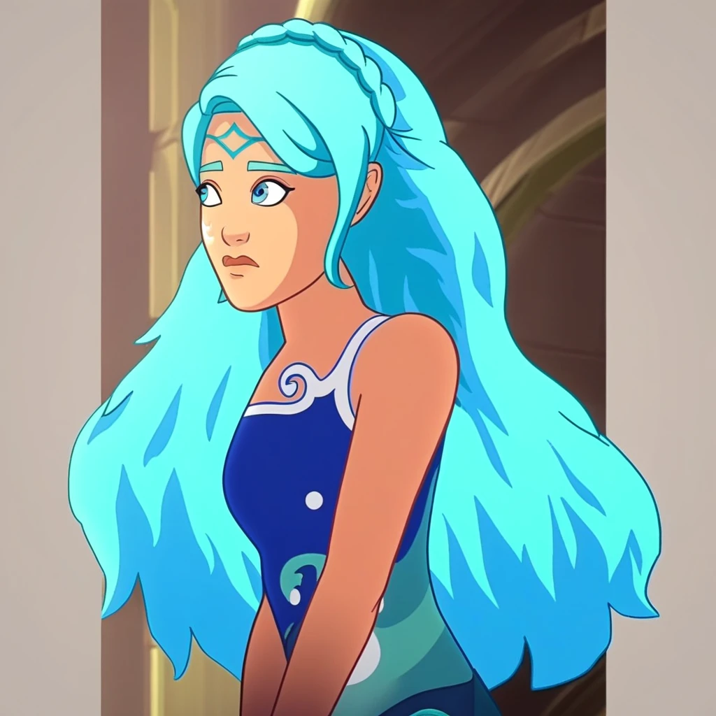S2_NaidaRiverheart, blue hair, blue eyes, gradient hair, light-skinned, tattoo on cheek, crown braid, long hair, solo