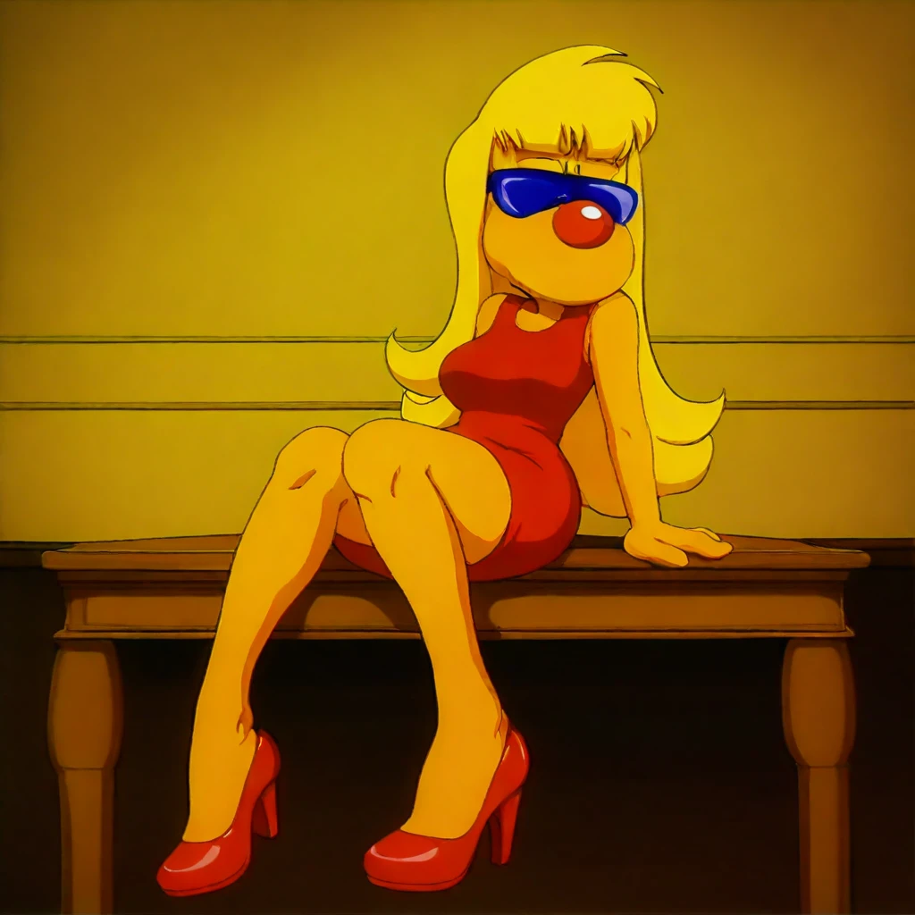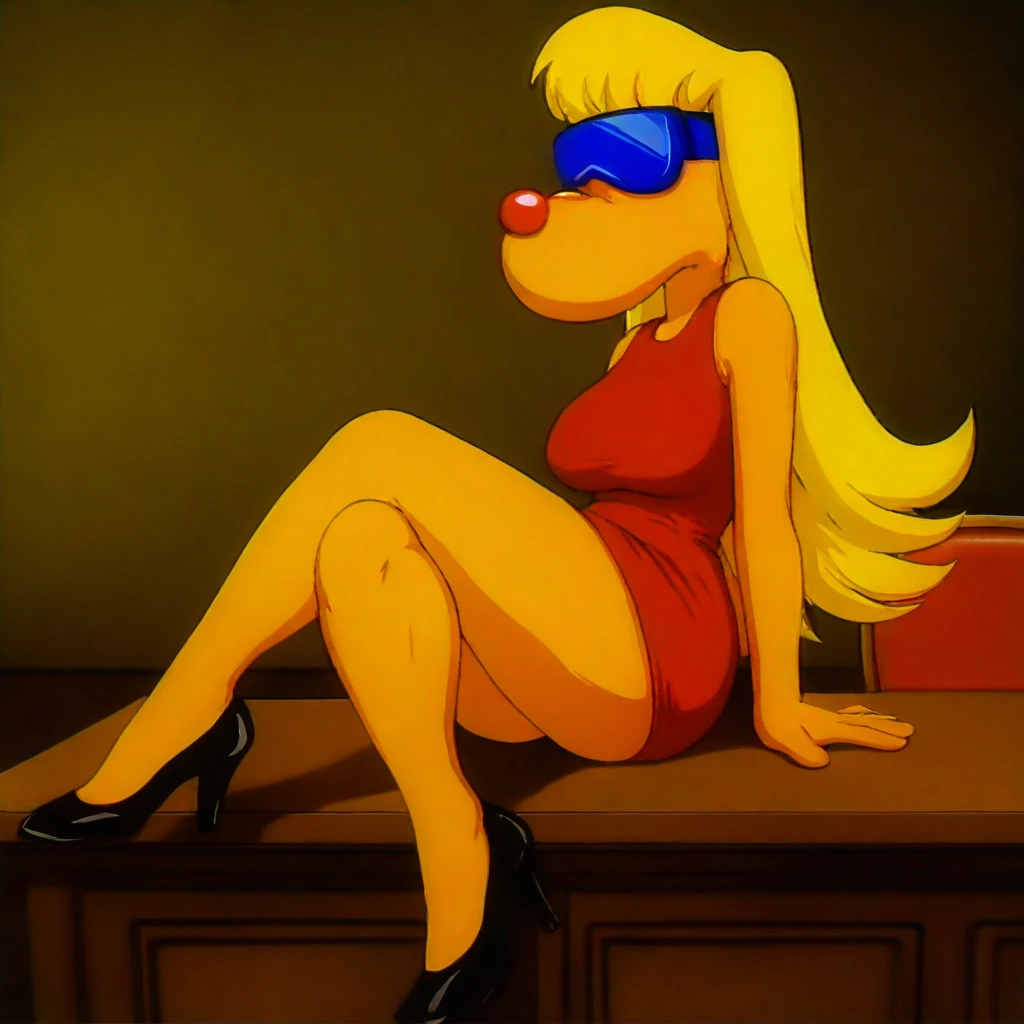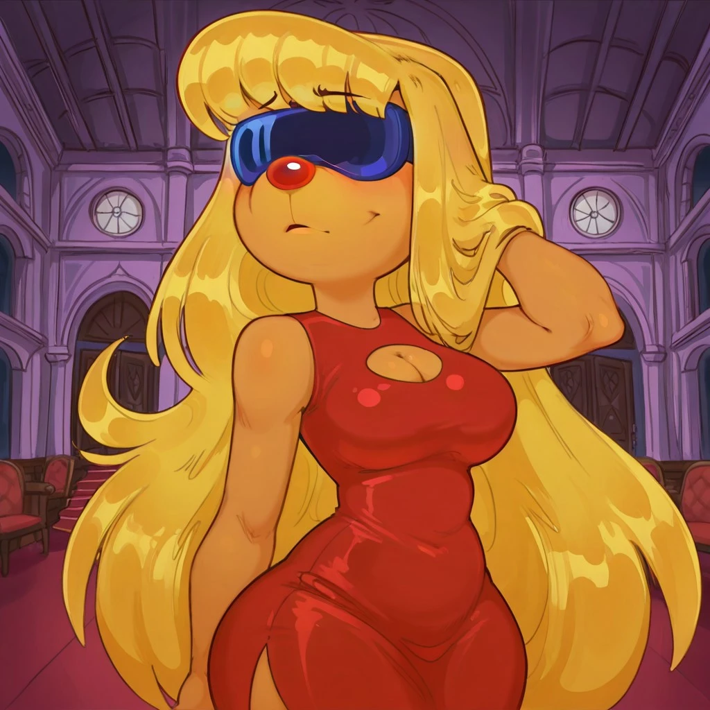 dog female, solo, red dress, curvy, red nose, dark blue opaque visor, orange fur, long yellow hair,
