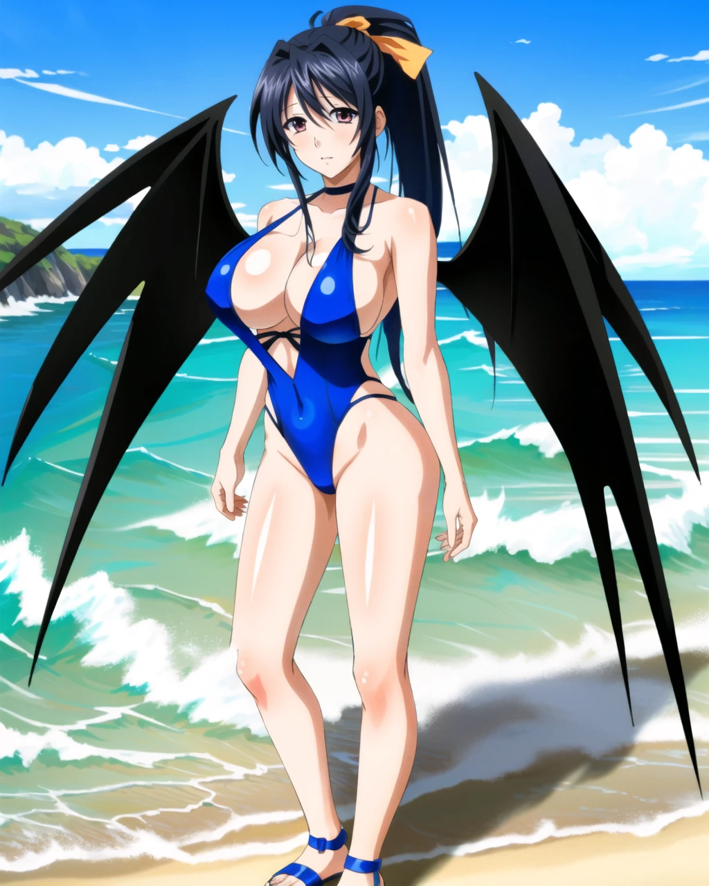 Tags for Himejima Akeno: 1girl, black hair, long hair, smile, ponytail, ribbon, breasts, large breasts, hair ribbon, very long hair, himejima akeno dxd, puple eyes