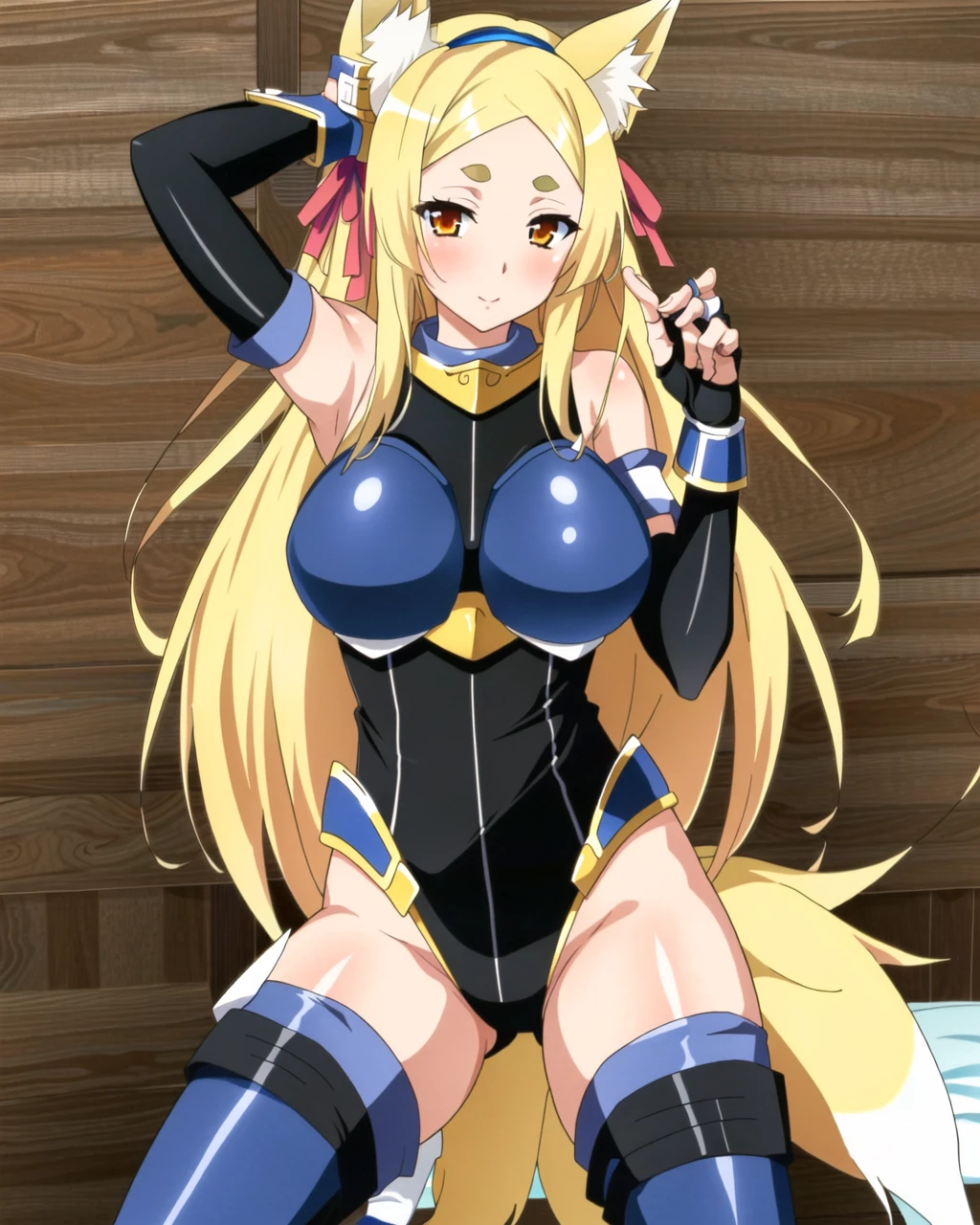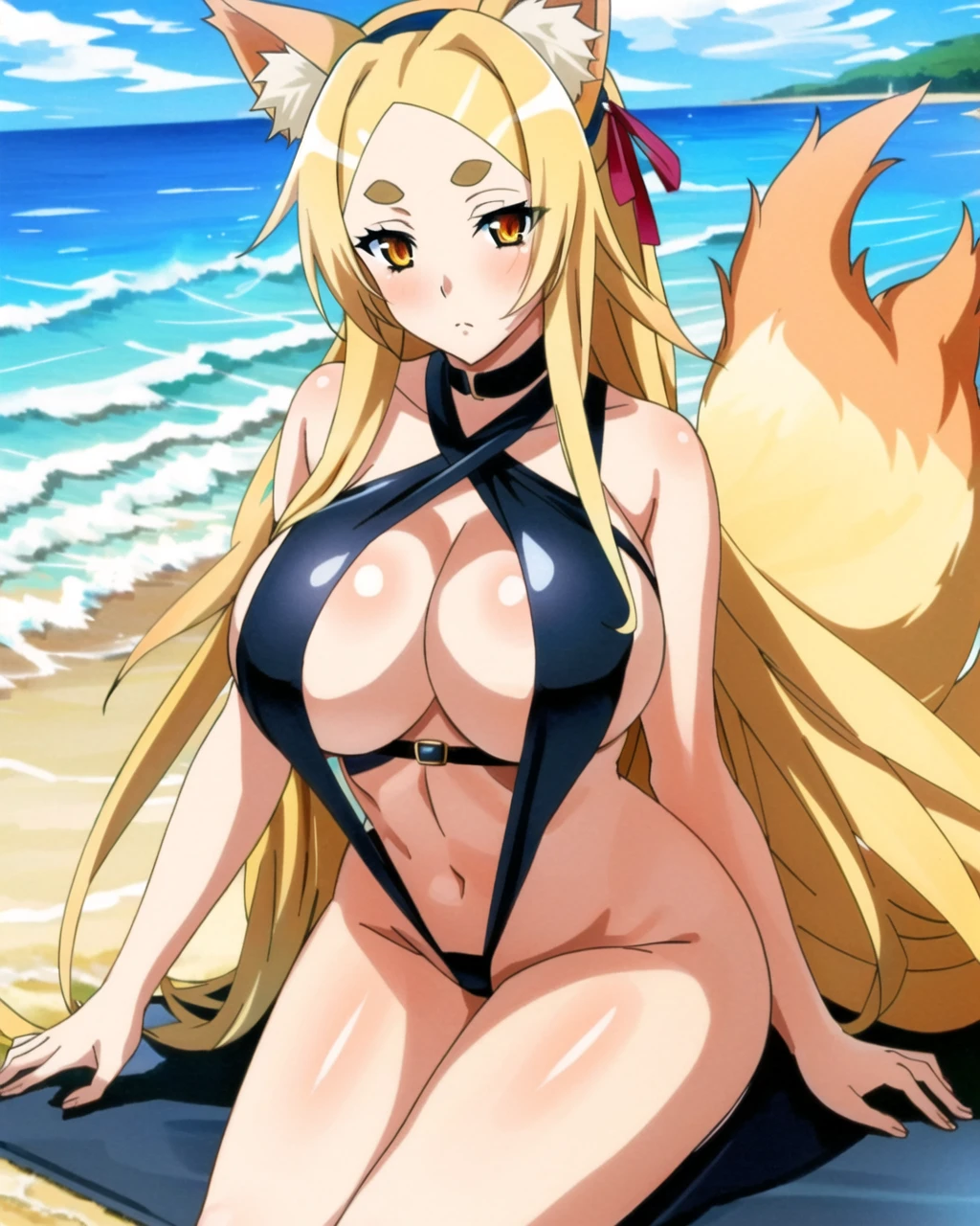 Tags for Yasaka: 1girl, cat ears, orange eyes, hair ornament, ribbon, hairband, yellow eyes, very long hair, animal ears, yasaka dxd, large breasts, blonde hair, long hair, fox ears, tail, fox tail, multiple tails,fox girl,thick eyebrows,