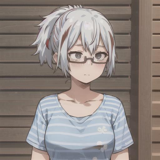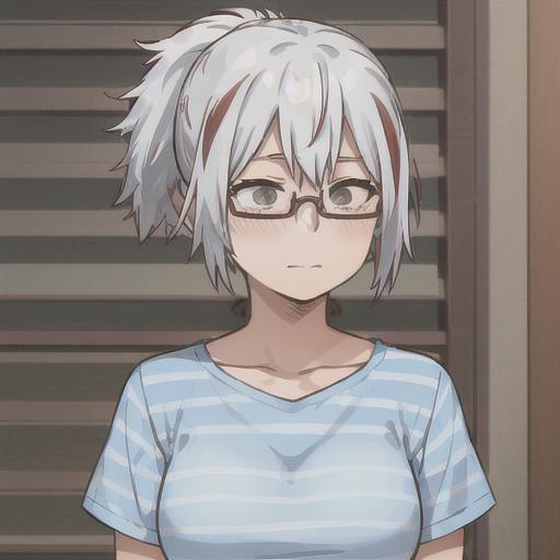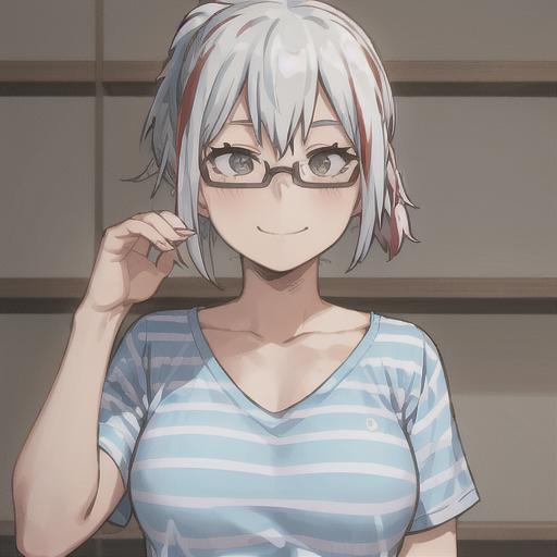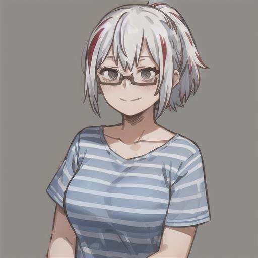 fuyumi todoroki, 1girl, solo, breasts, short hair, shirt, collarbone, upper body, ponytail, white hair, short sleeves, red hair, multicolored hair, glasses, striped, streaked hair, grey eyes, own hands together, blue shirt, semi-rimless eyewear, under-rim eyewear, striped shirt, smile