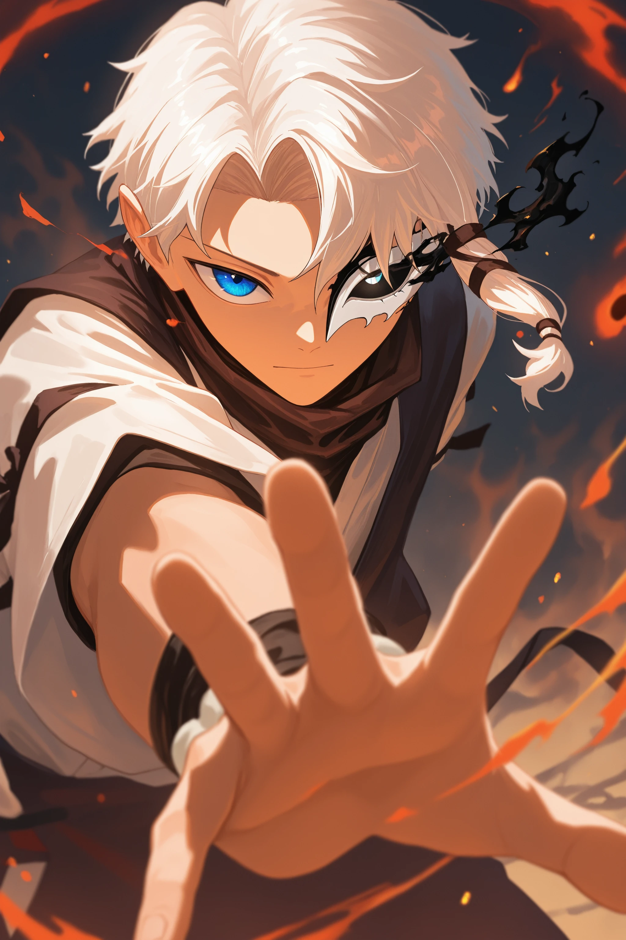 An exmaple prompt for his eye mask: [eye trail : black fire, flame : 0.3 ] half mask, one eye covered
