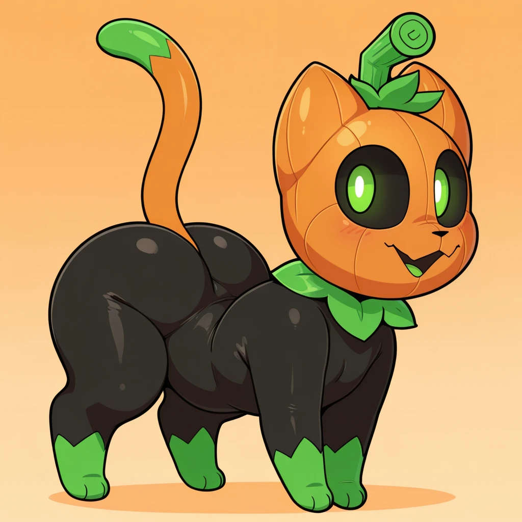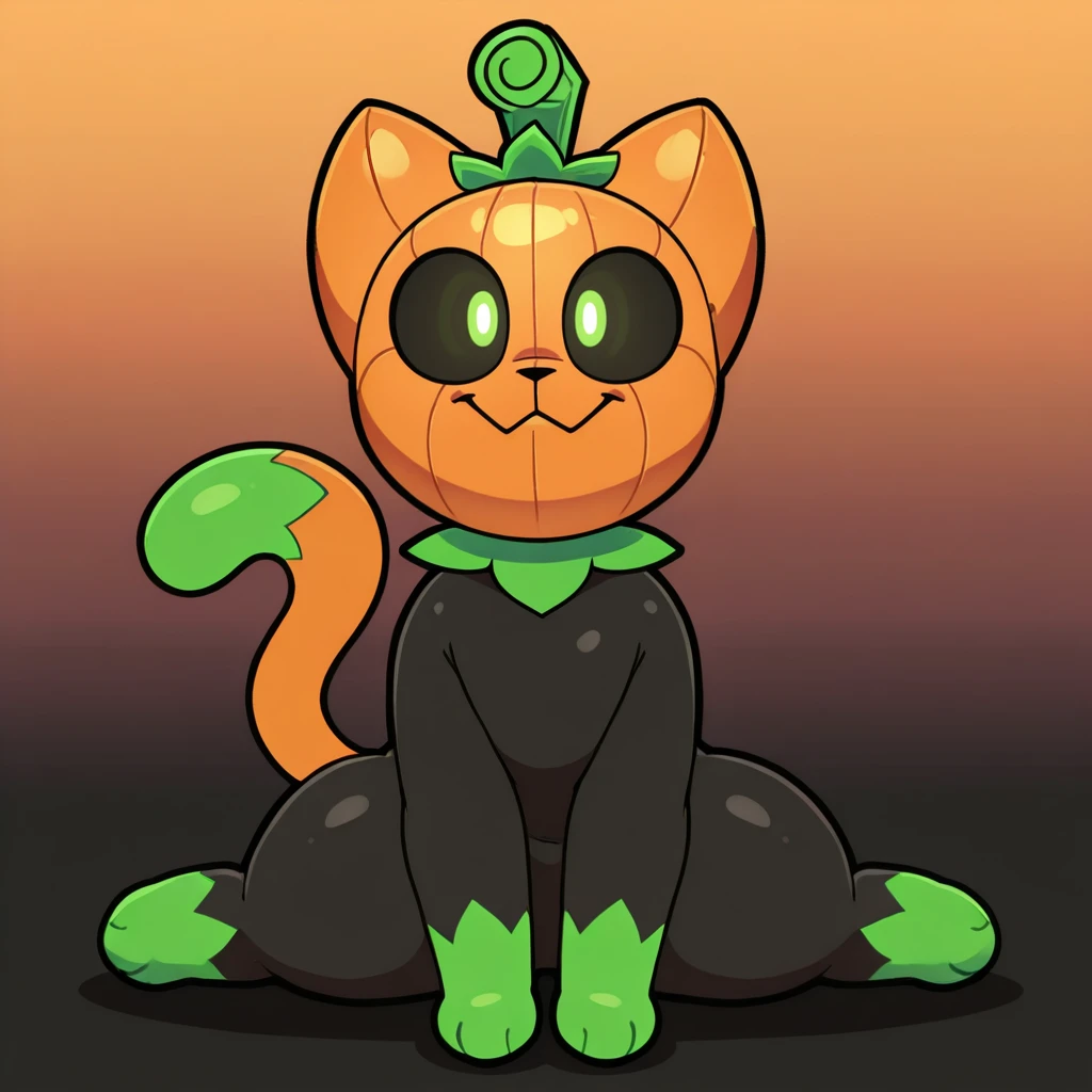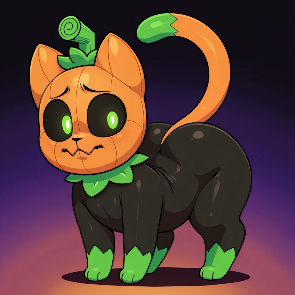 1boy, male, furry, feral, quadruped, feline, cat, solo, black body, pumpkin-shaped head, black sclera, green eyes, black nose, cat ears, green neck tuft, green paws, orange pawpads, tail, dipstick tai