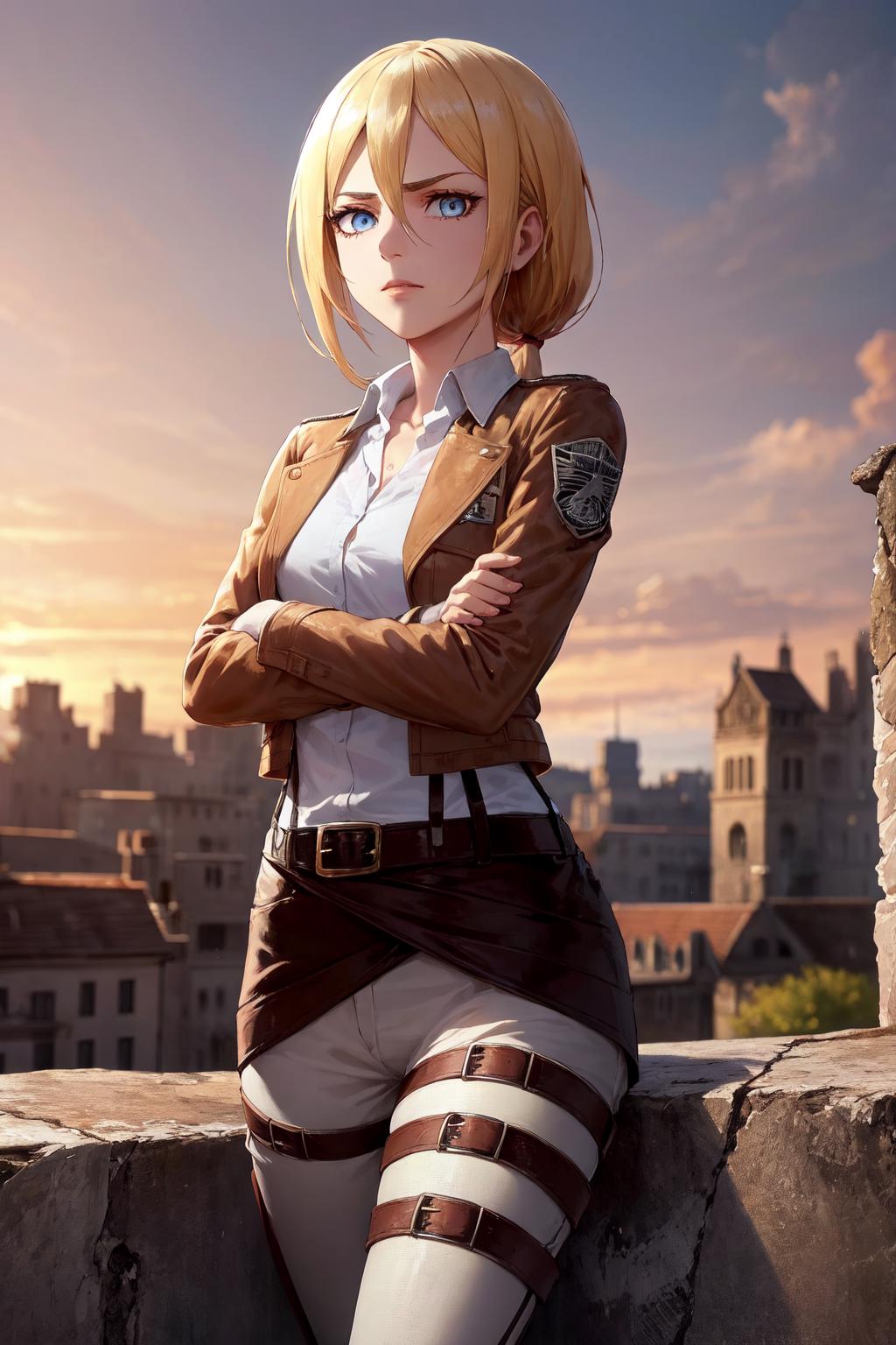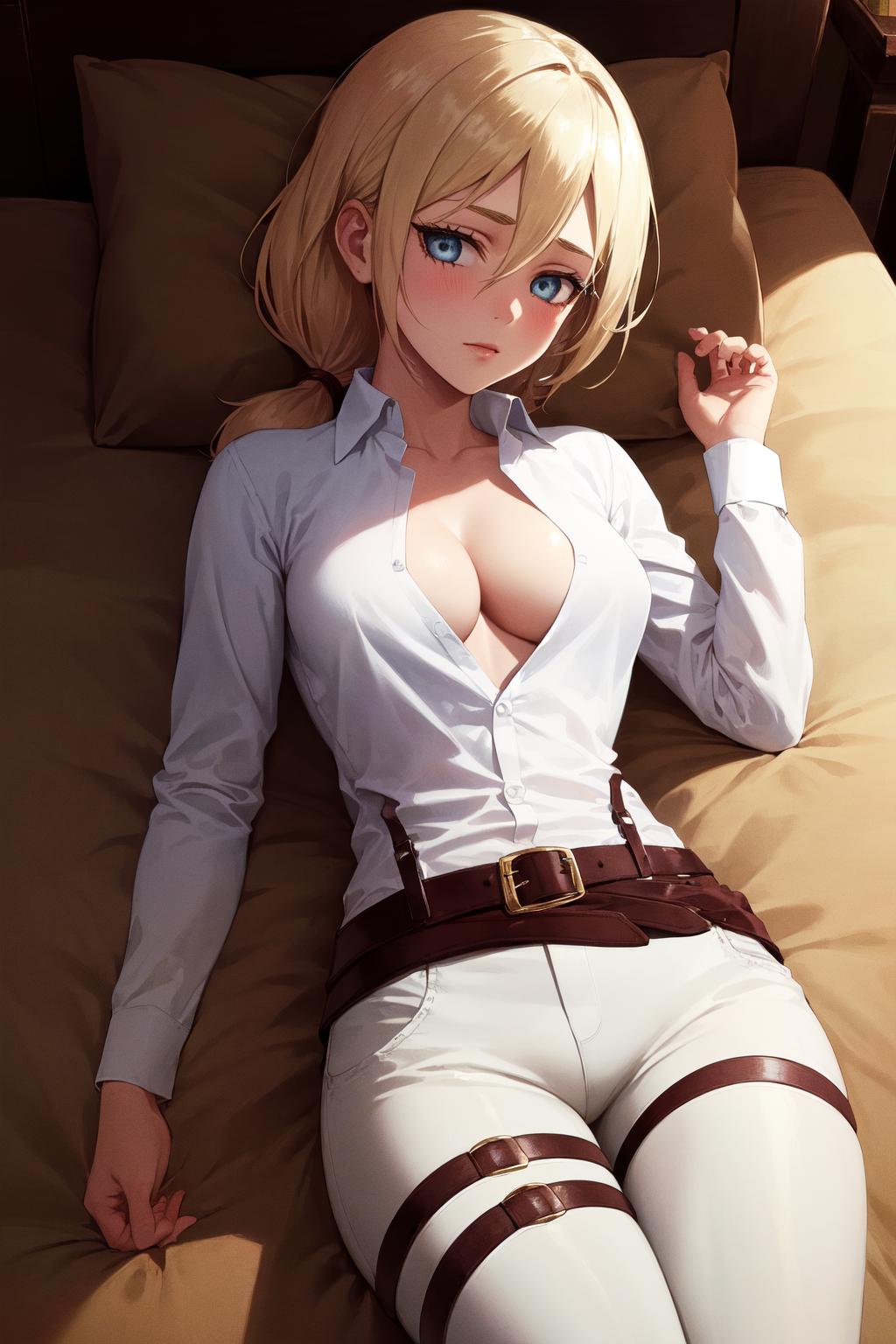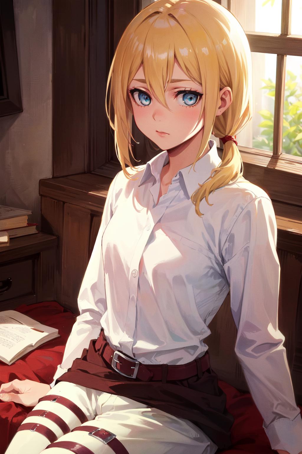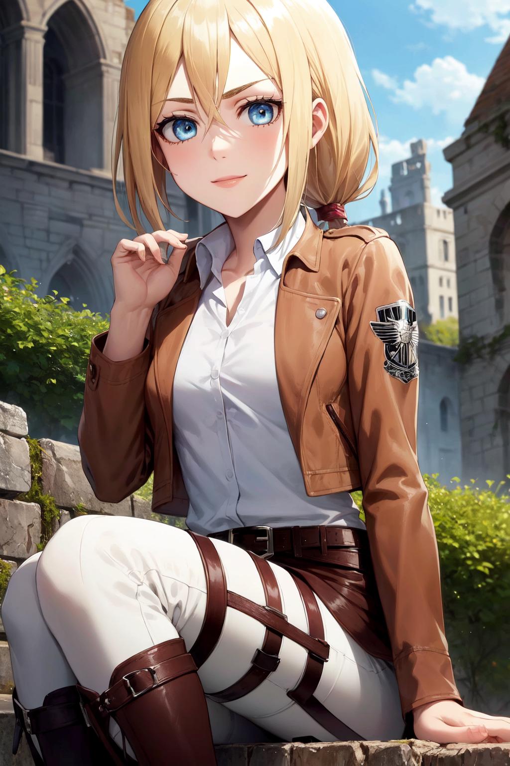 historia, christa renz, blonde hair, blue eyes, hair between eyes, short hair, ponytail, jacket, brown jacket, emblem, belt, thigh strap, pants, boots, shirt, white shirt, collared shirt, **(shorts)**If you want to remove the jacket, I suggest putting "jacket, brown jacket" in the negative prompt, because otherwise it will appear from time to time.