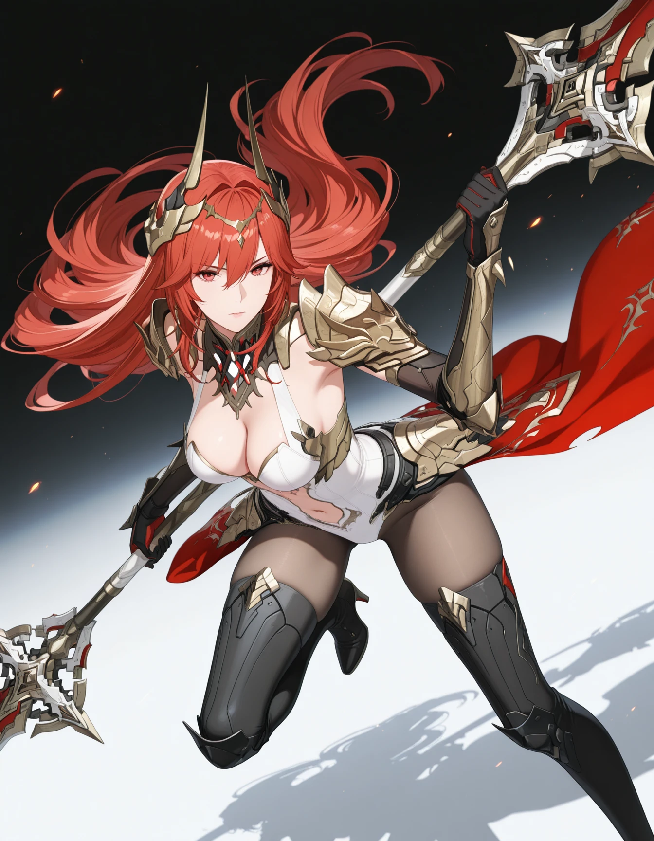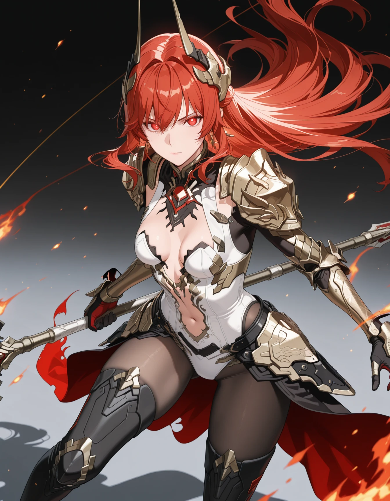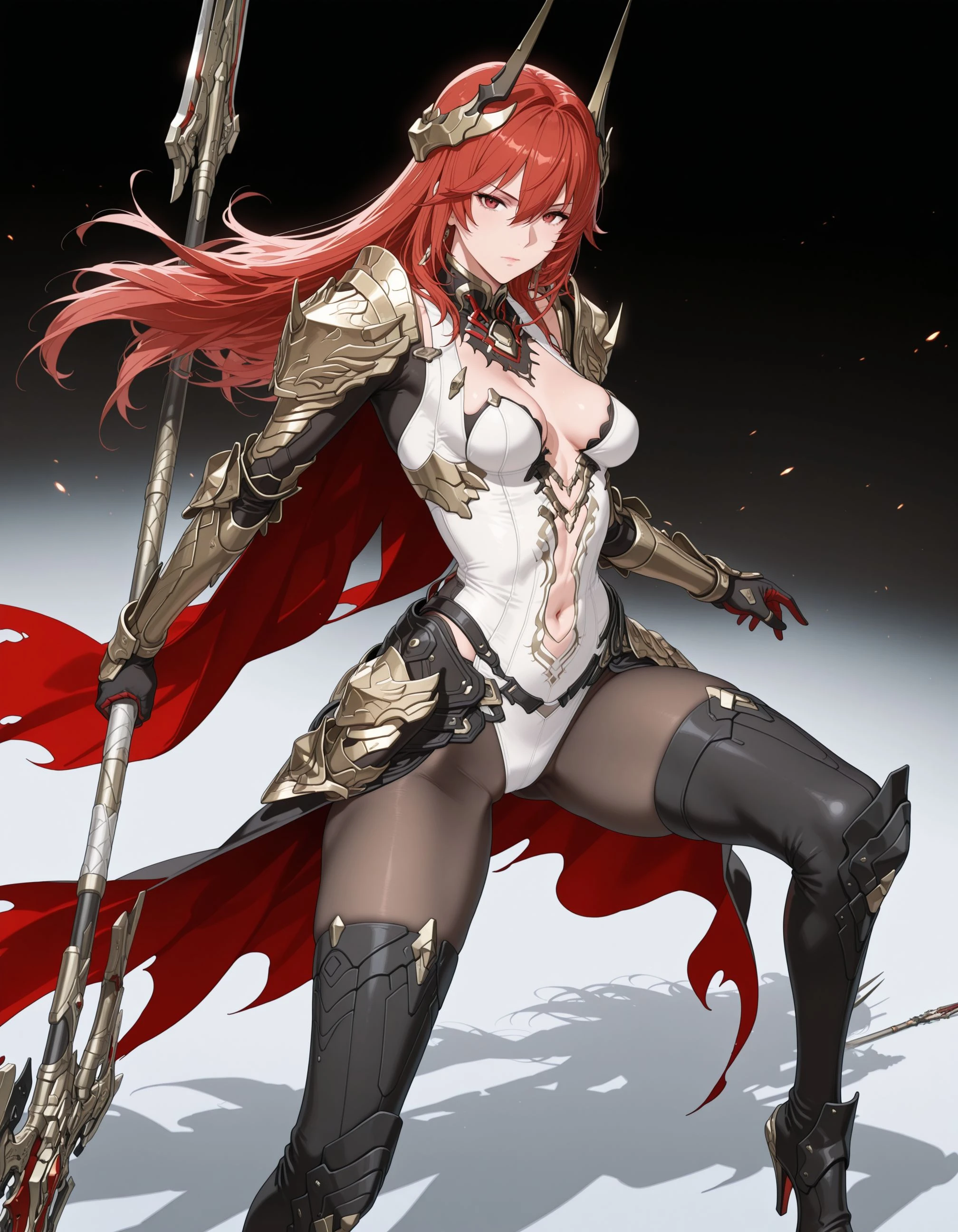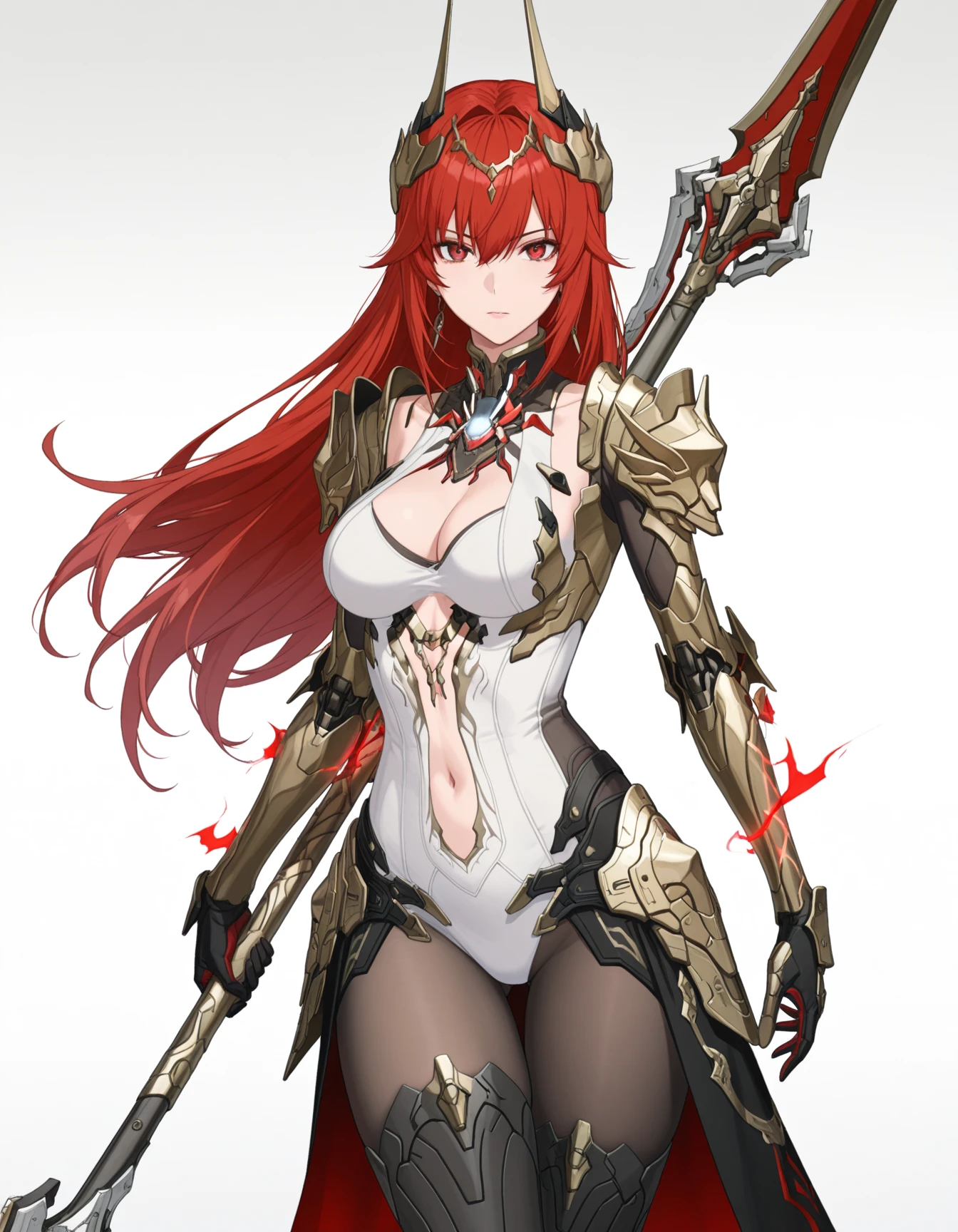 1girl,mai_pgr_vera_zw,mature female,(age up:2),(small_ breasts:2),solo,long_hair,breasts,looking_at_viewer,hair_ornament,gloves,red_eyes,thighhighs,holding,navel,hair_between_eyes,closed_mouth,cleavage,weapon,pantyhose,red_hair,boots,horns,black_footwear,holding_weapon,armor,leotard,high_heels,bodysuit,shadow,thigh_boots,headgear,shoulder_armor,polearm,gauntlets,high_heel_boots,pauldrons,spear,white_leotard,holding_polearm,waist_capeRecommend preferred Strength: 0.7~1.