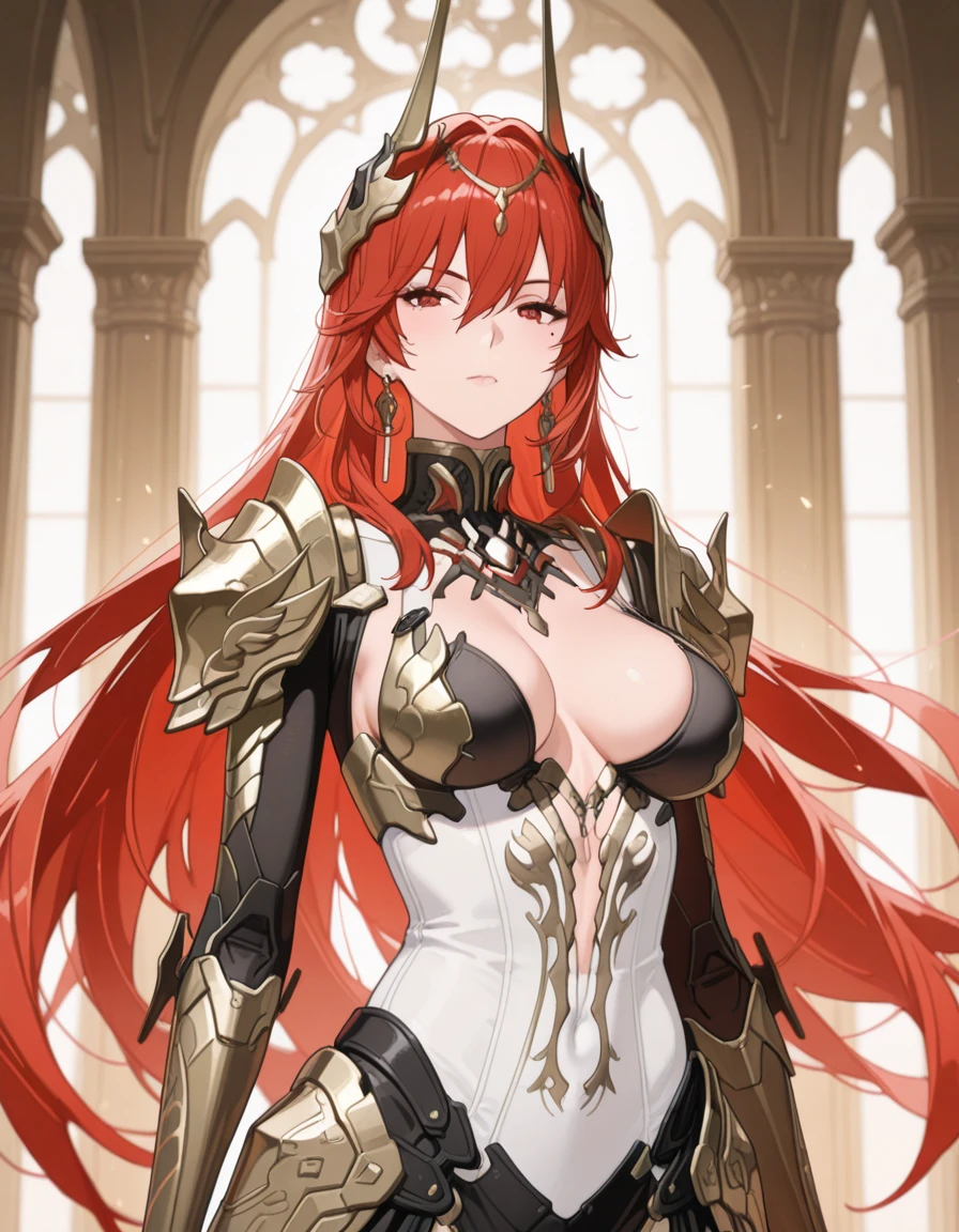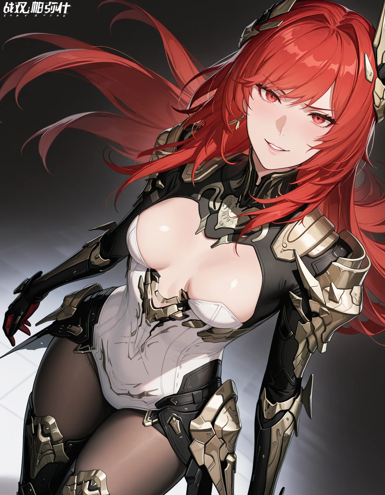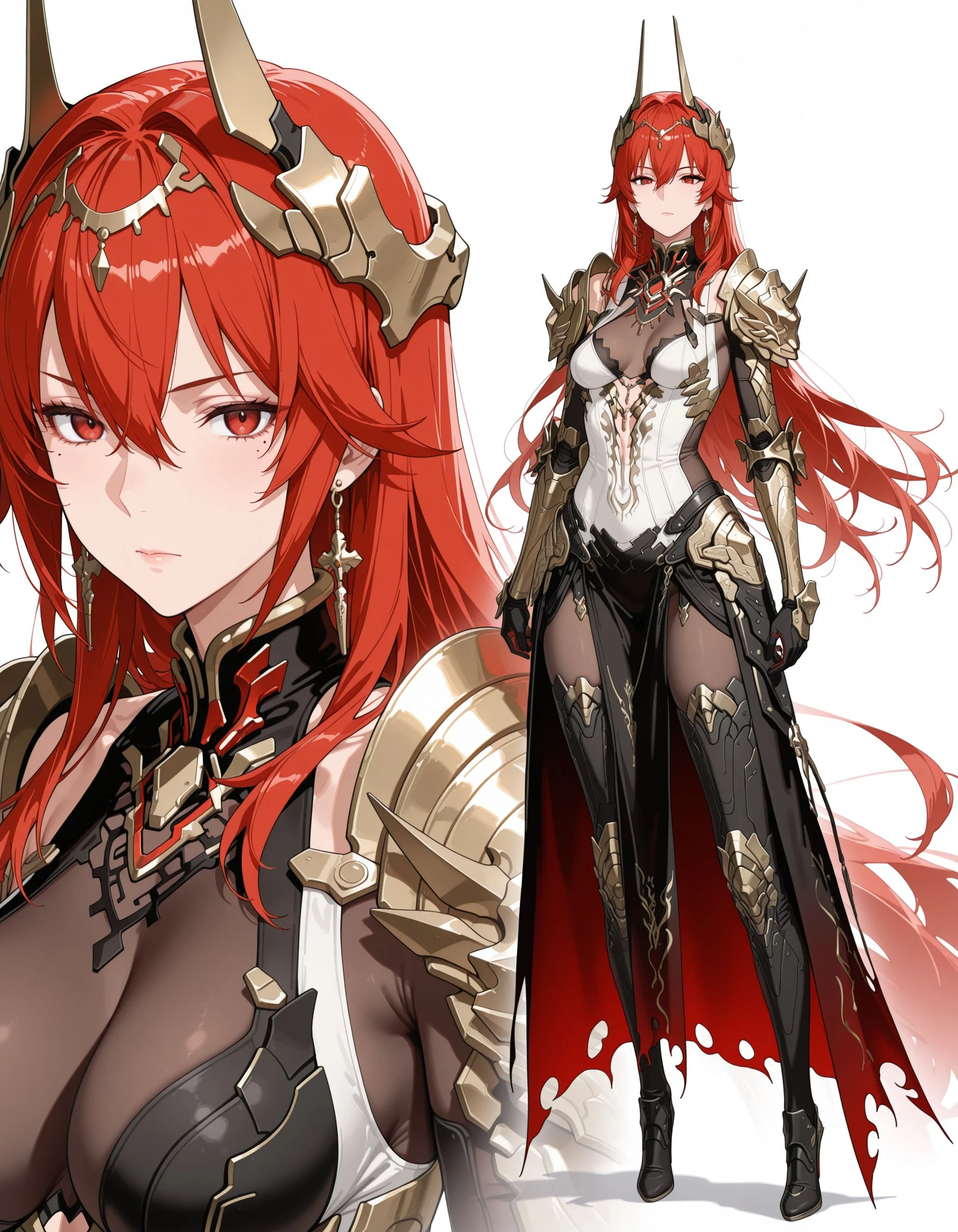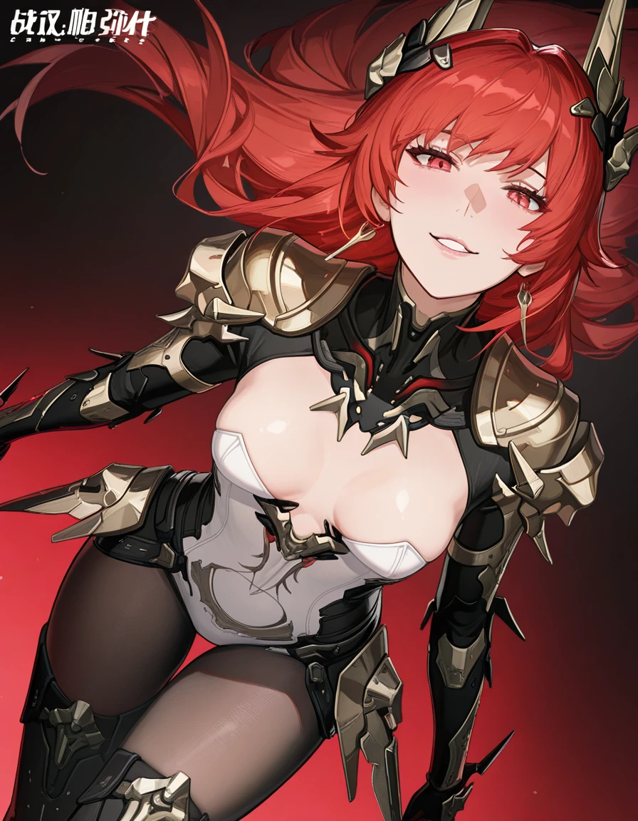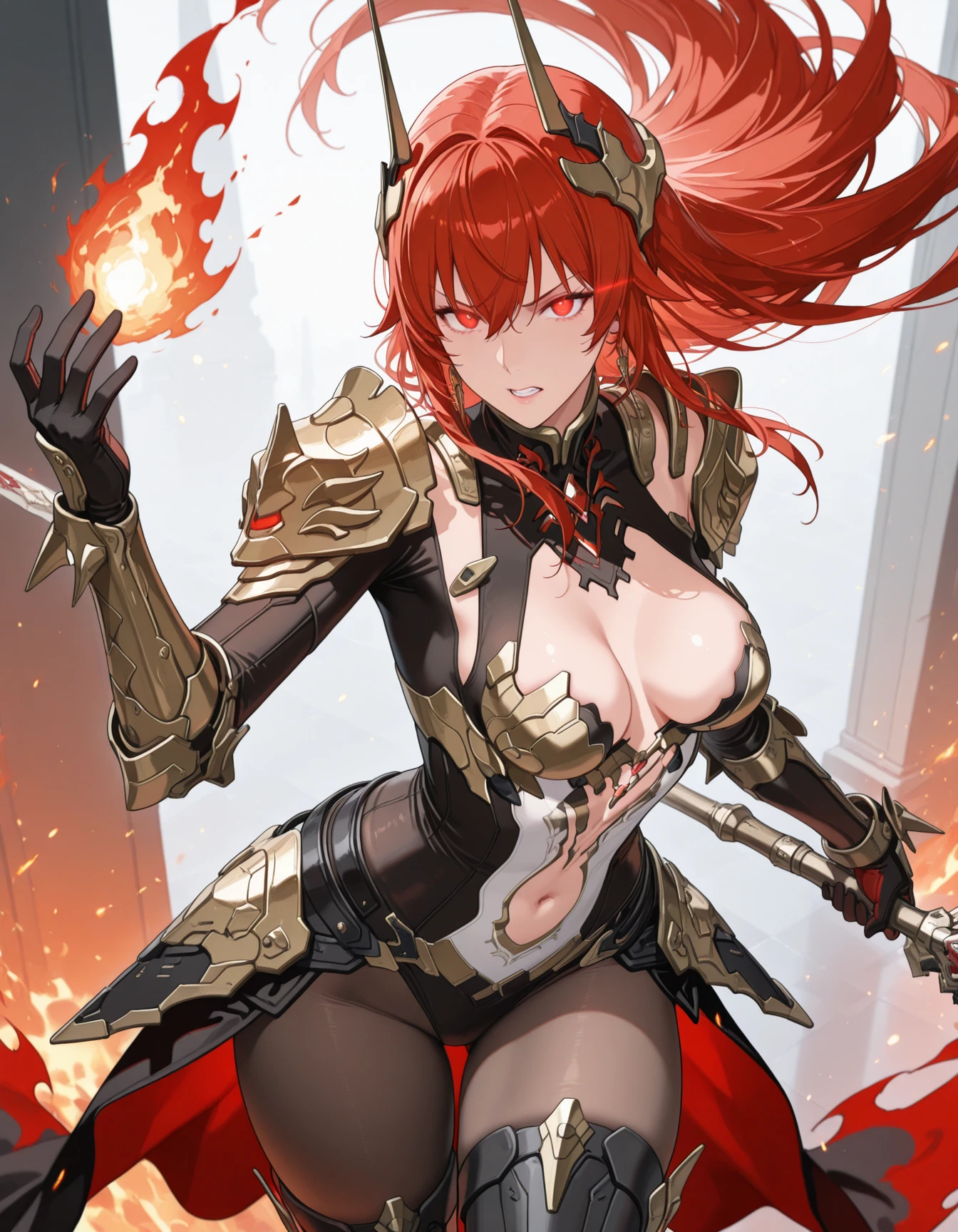 1girl,mai_pgr_vera_zw,mature female,(age up:2),(small_ breasts:2),solo,long_hair,breasts,looking_at_viewer,hair_ornament,gloves,red_eyes,thighhighs,holding,navel,hair_between_eyes,closed_mouth,cleavage,weapon,pantyhose,red_hair,boots,horns,black_footwear,holding_weapon,armor,leotard,high_heels,bodysuit,shadow,thigh_boots,headgear,shoulder_armor,polearm,gauntlets,high_heel_boots,pauldrons,spear,white_leotard,holding_polearm,waist_capeRecommend preferred Strength: 0.7~1.