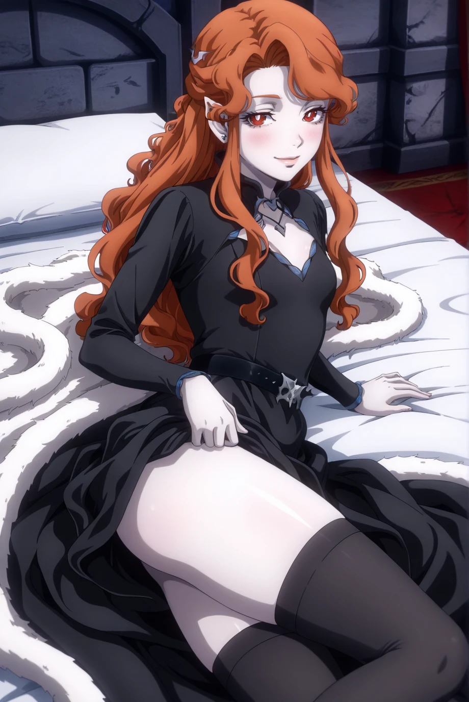 <lora:Lenore-IL-v1-08:0.9>, ChopioLenore, orange hair, long hair, wavy hair, sidelocks, asymmetrical bangs, half updo, eyelashes, lips, pointy ears, red eyes, bright pupils, looking at viewer, anime coloring, vampire, pale skin, hair ornament, earrings,