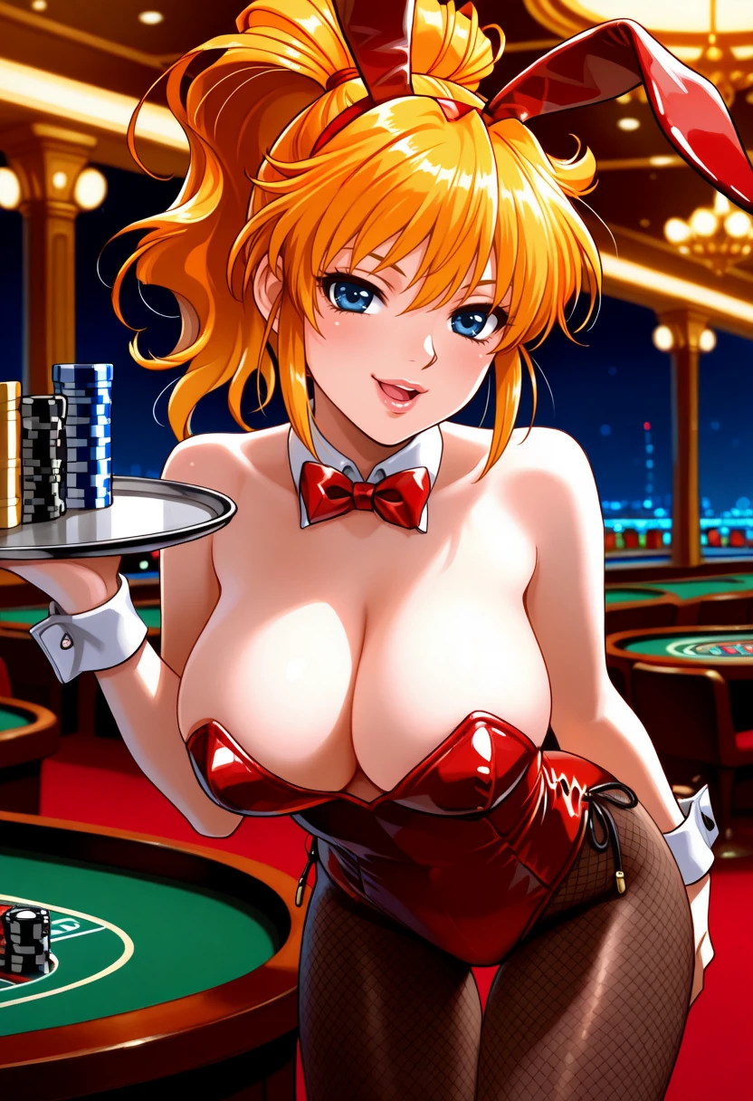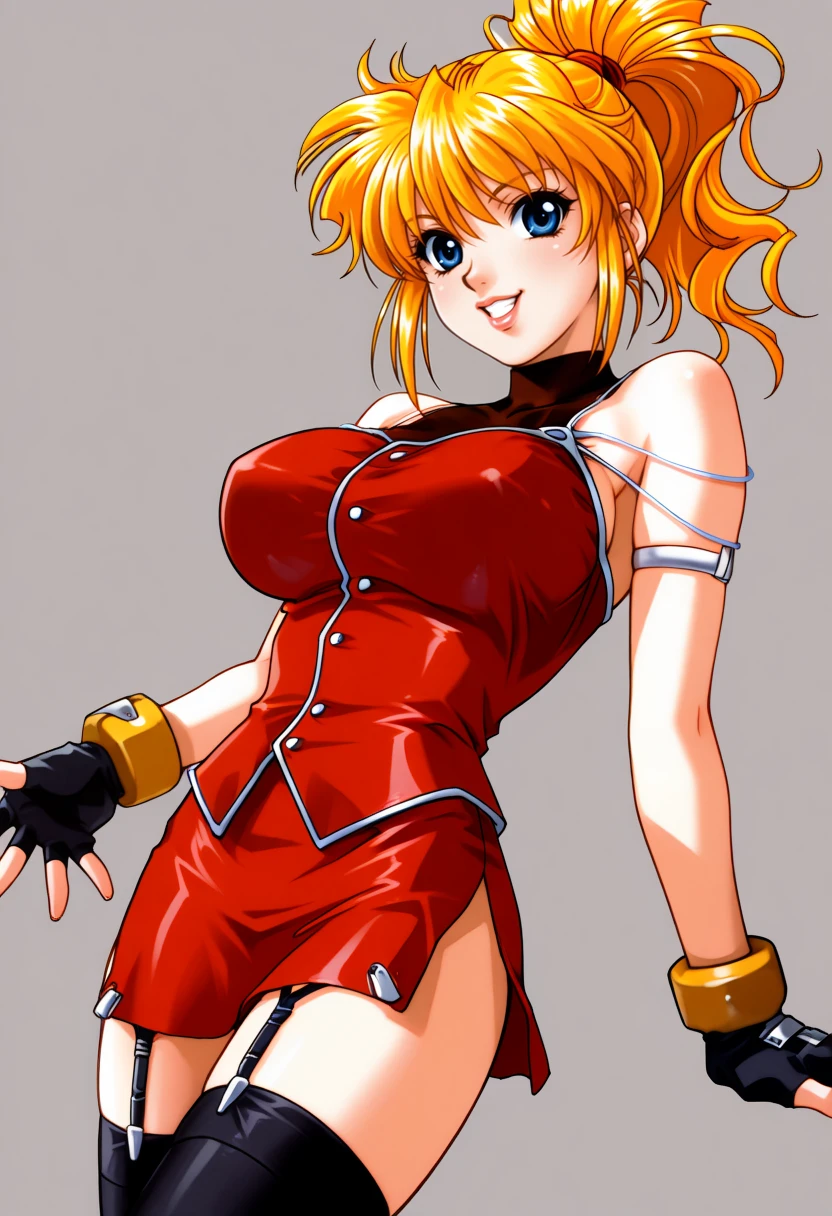 white jacket, long sleeves, armlet, fingerless gloves, turtleneck, red dress, miniskirt, side slit, garter straps, black thighhighs, large breasts, blonde hair, bangs, ponytail, sidelocks, blue eyes, lips