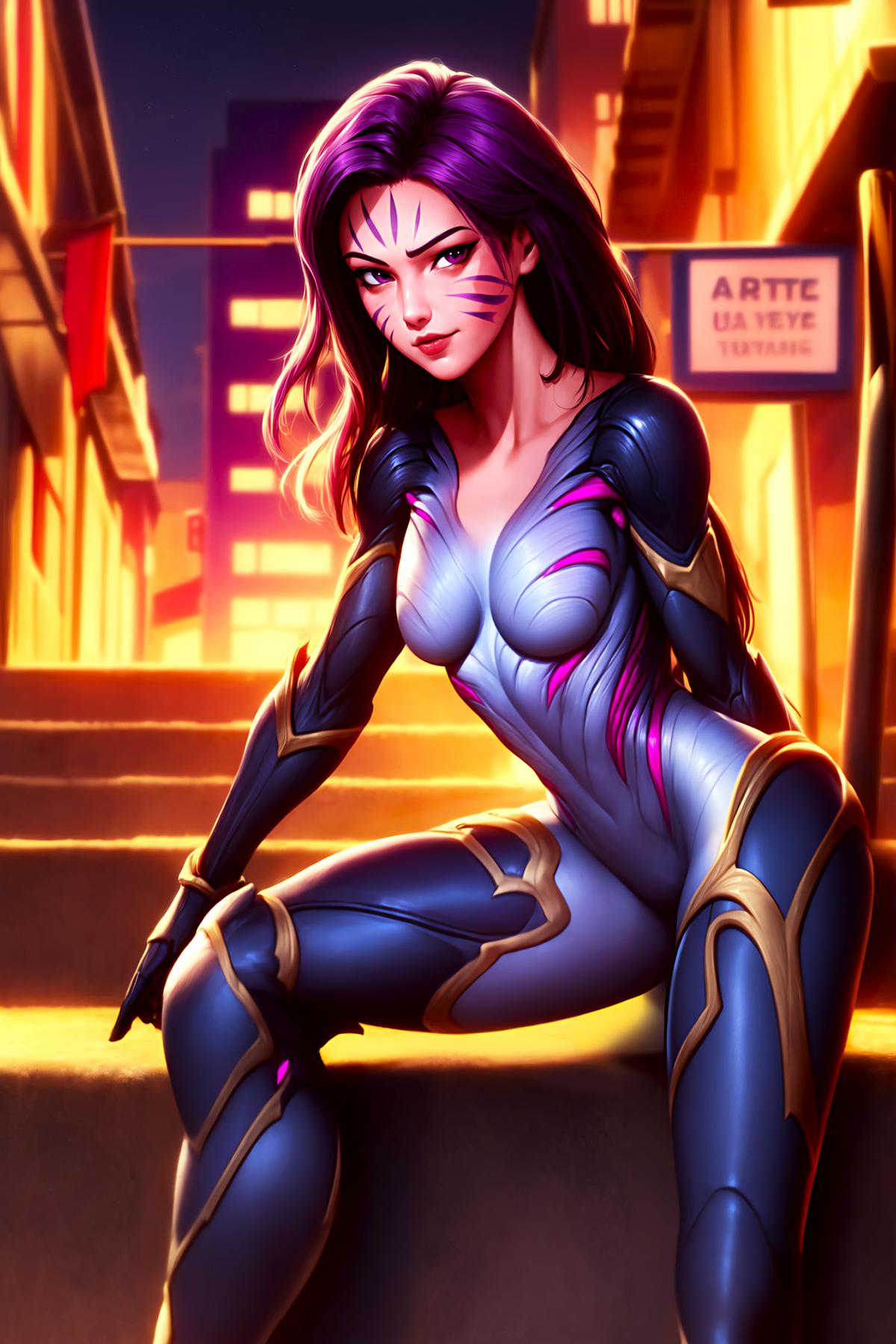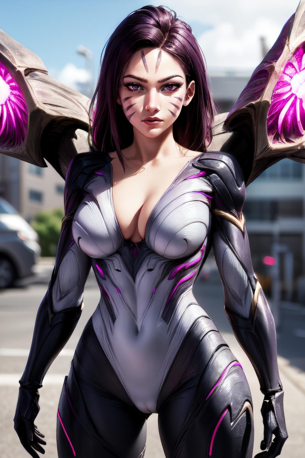 About Trigger Words & Prompts: "kaisamv1a" is the main trigger. There is also "black hair, purple hair, bodysuit, facial mark, forehead mark, purple eyes, purple lipstick, and lips for thicker lips". Till it is so hard to manage the Armor, I recommend you to use inpaint for faces.