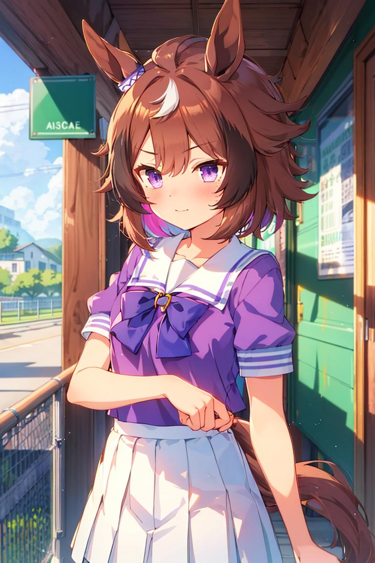 tracen school uniform,school uniform,summer uniform,sailor shirt,serafuku,purple shirt,puffy short sleeves,white skirt,white thighhighs,purple bowtie,purple bow,horseshoe ornament,brown footwear,zettai ryouiki,