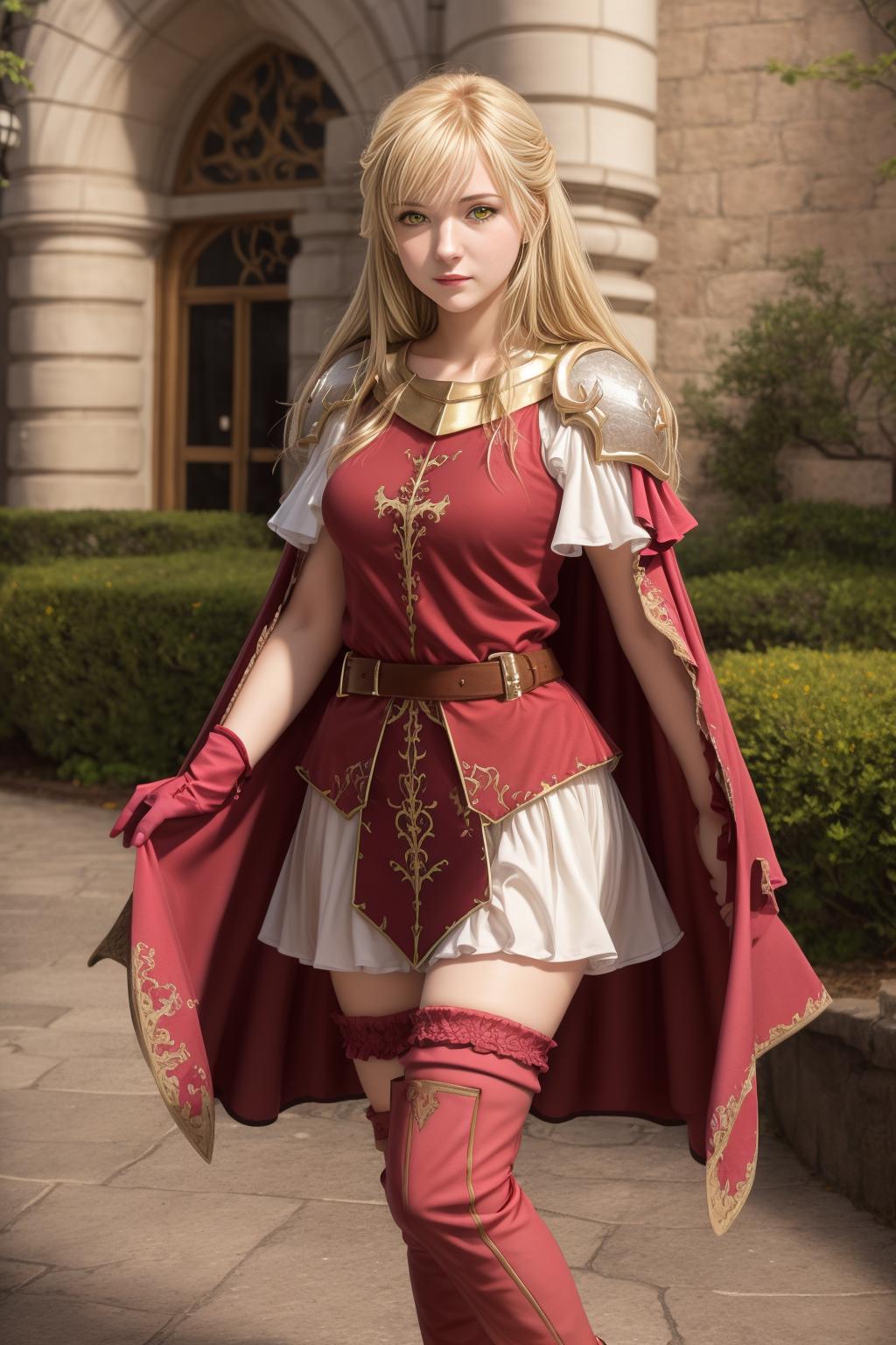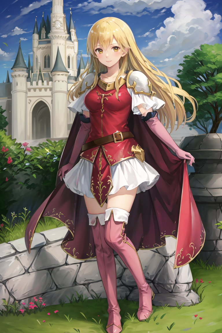 Recommended prompt for outfit: lachesis fe, 1girl, solo, long hair, skirt, thigh boots, elbow gloves, belt, cape, armor, zettai ryouiki, shoulder armor.