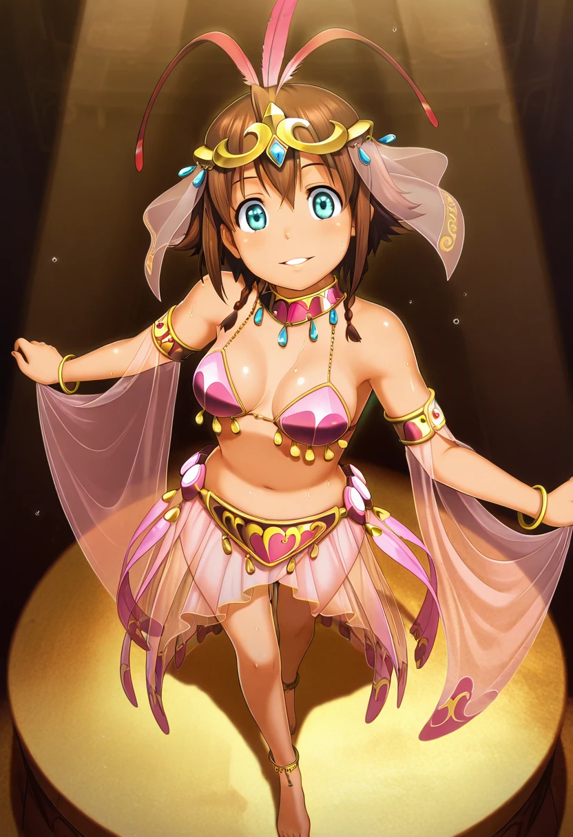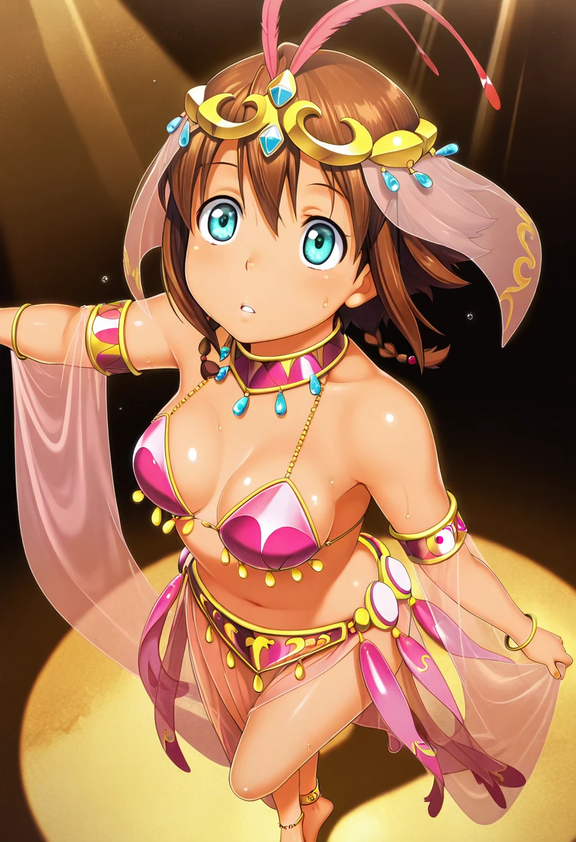 amydancer, hair ornament, feather hair ornament, tiara, veil, pink choker, bracelet, jewelry, armlet, see-through sleeves, detached sleeves, gold trim, dancer, harem outfit, arabian clothes, belly dancer, pink bikini, bikini armor, see-through, midriff, anklet,Description