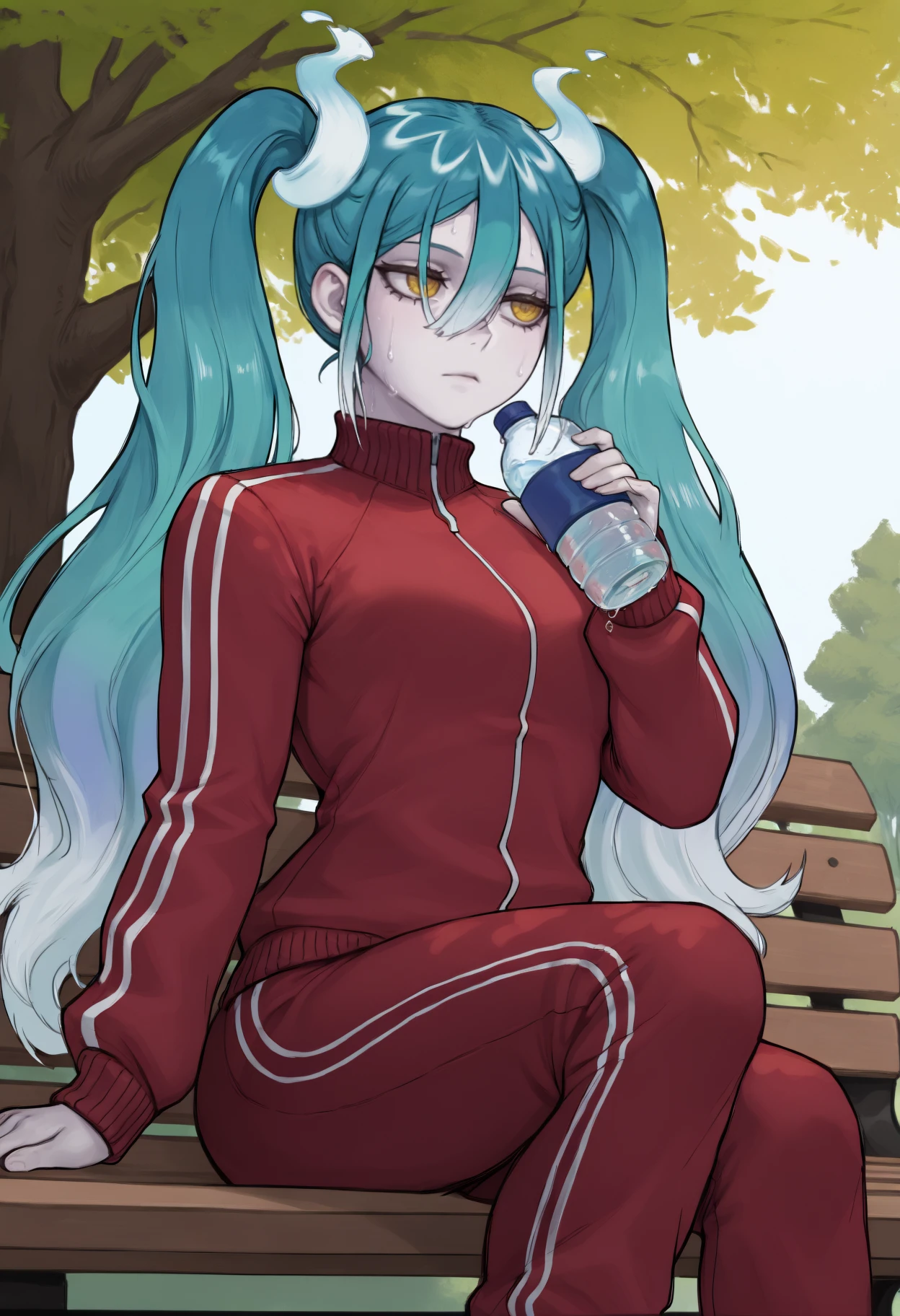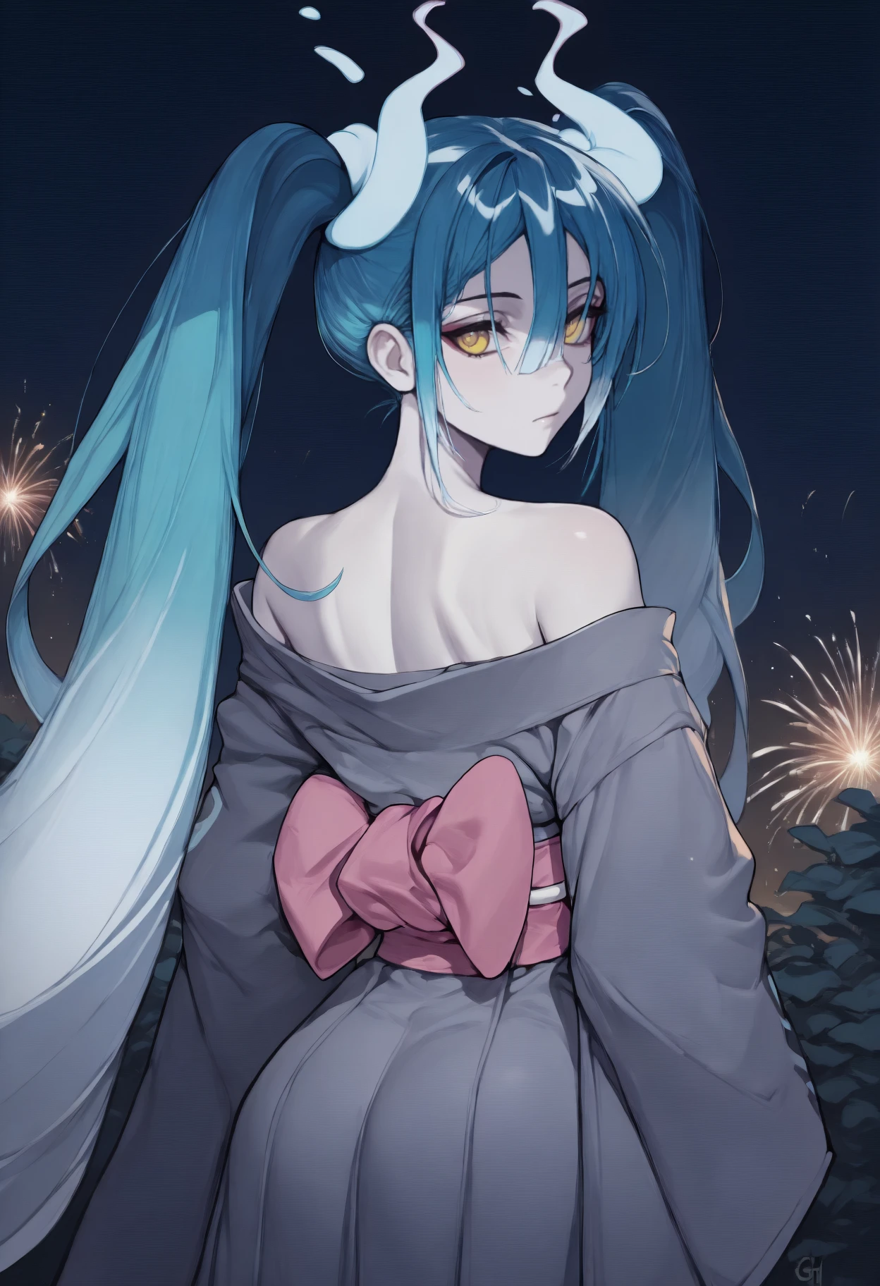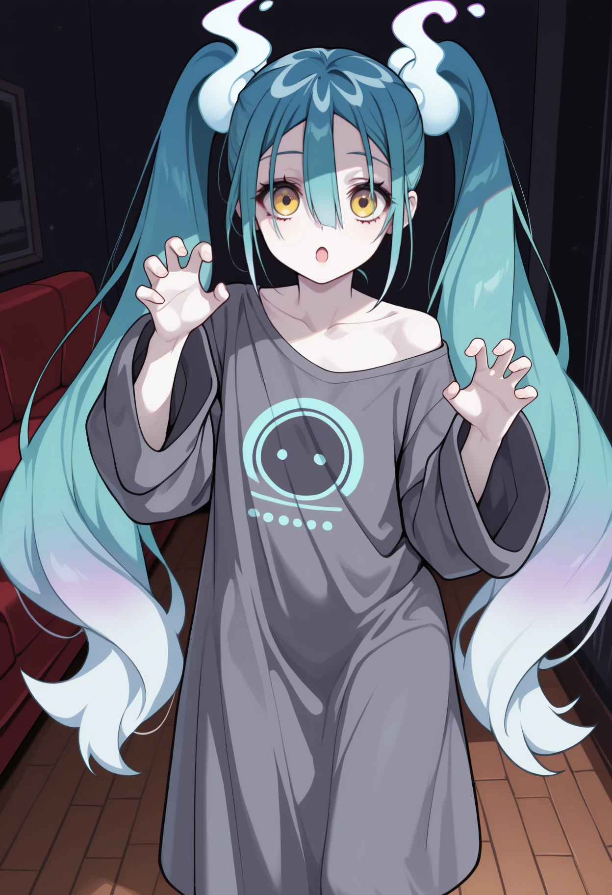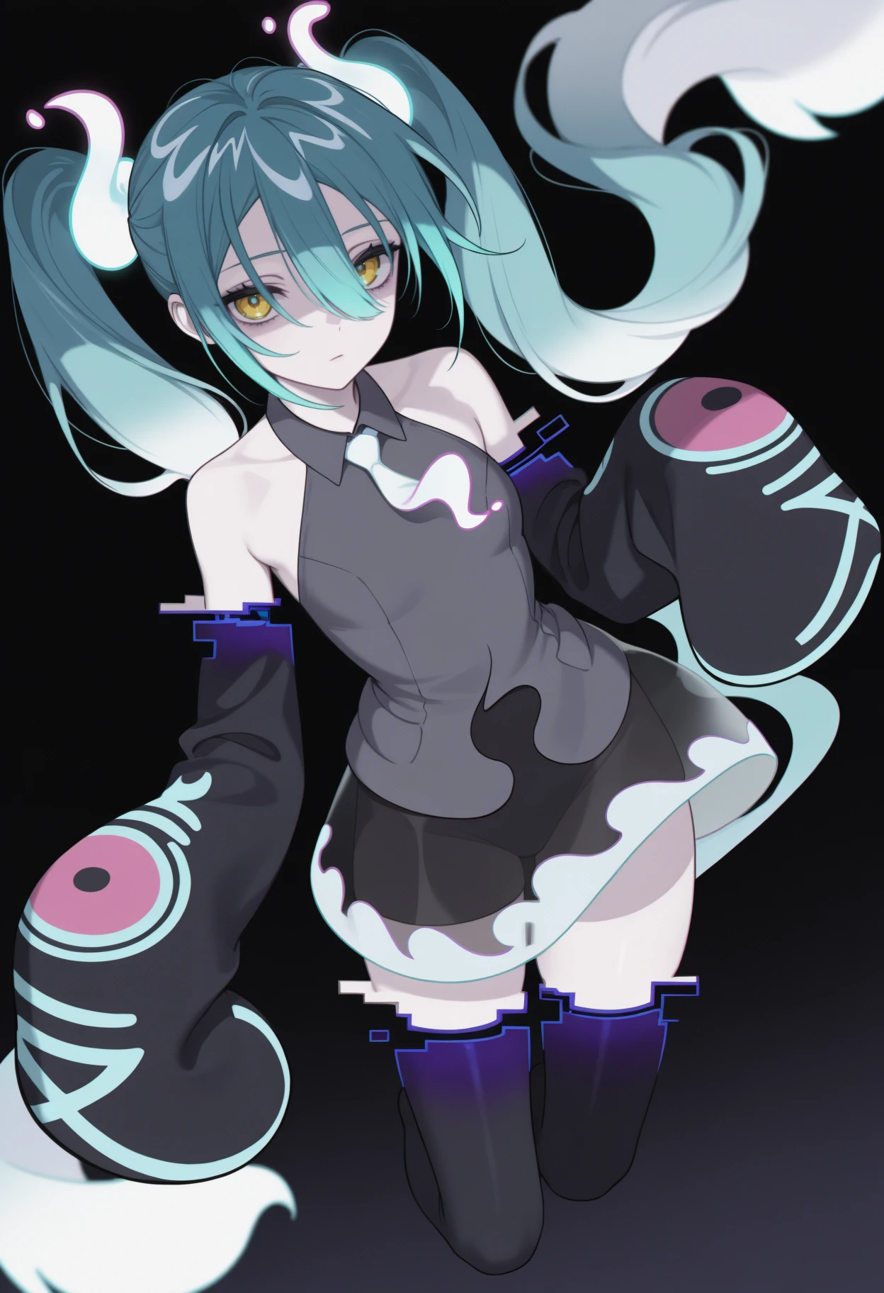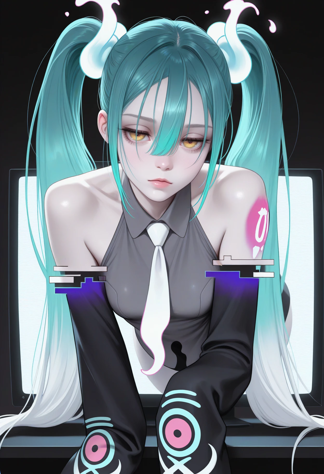 Trigger + Appearance: gh0stmiku, pale skin, gradient hair, aqua hair, white hair, hair between eyes, twintails, yellow eyes