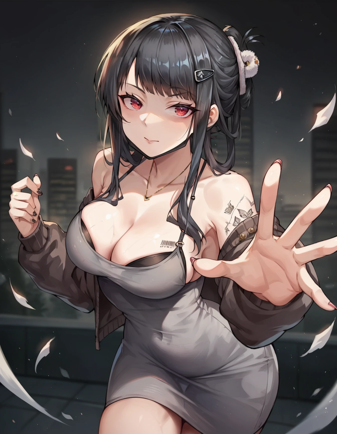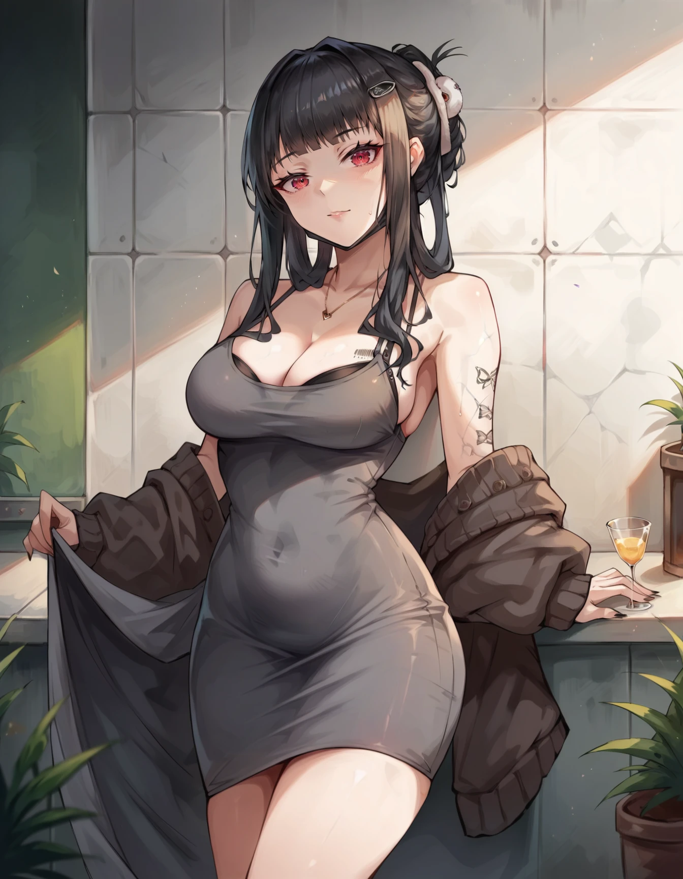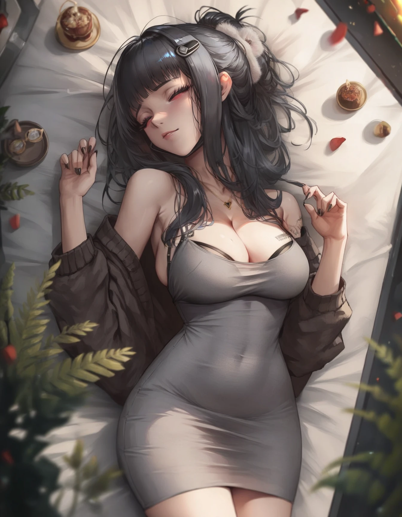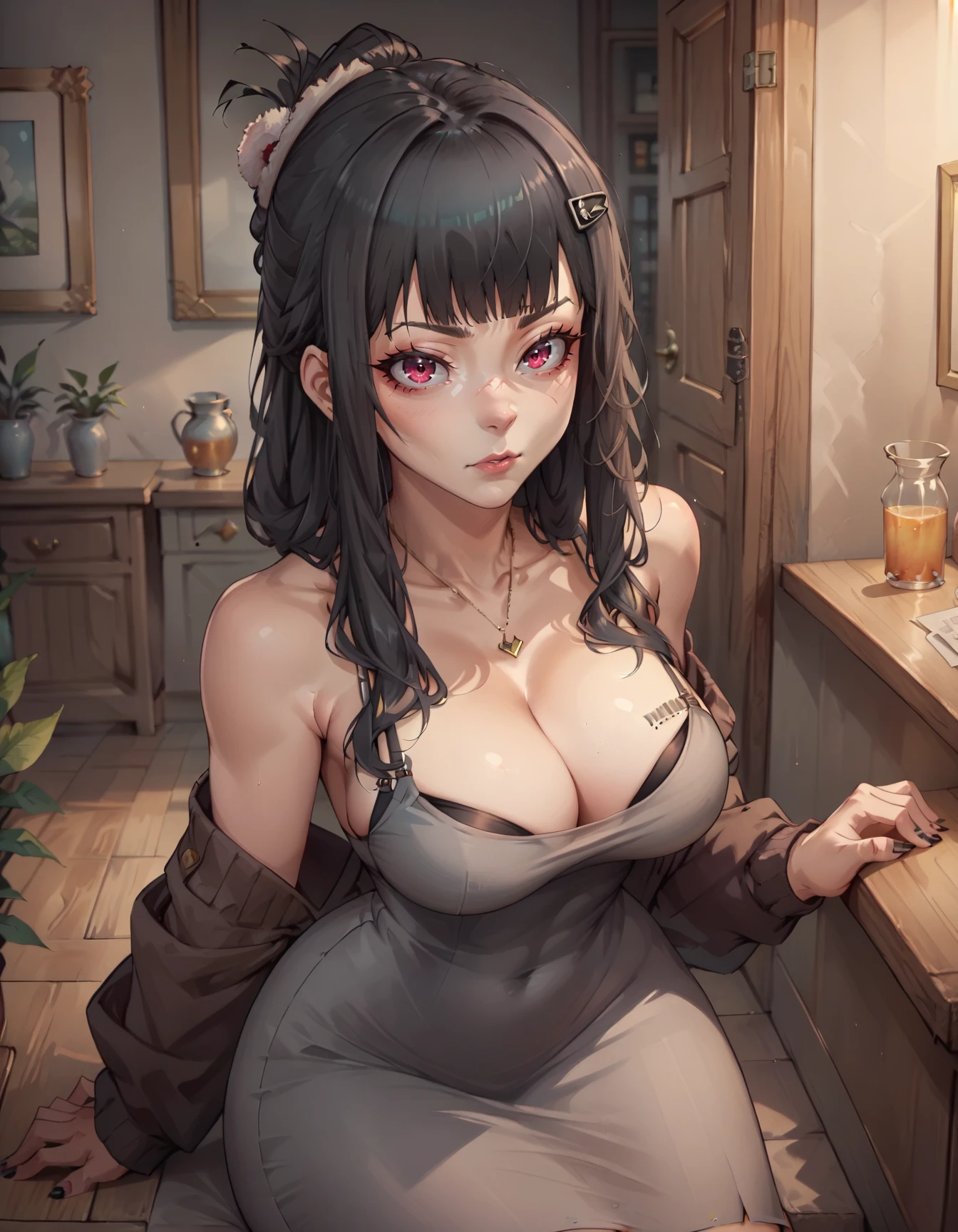 dress, black hair, cleavage - To emphasize a couple parts