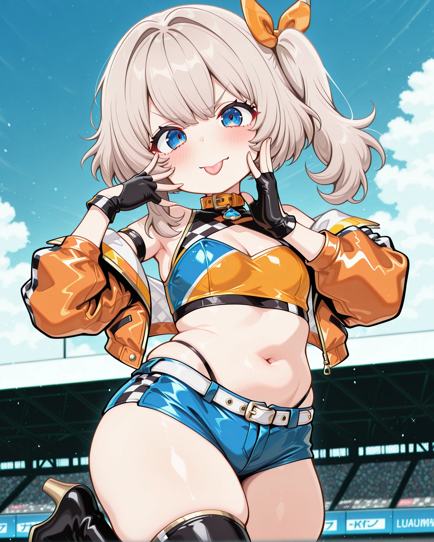 RaceFishPrin, blue eyes, platinum blonde hair, medium hair, side ponytail, bare shoulders, armlet, race queen, two-tone crop top, cleavage cutout, collar, midriff, navel, black fingerless gloves, white belt, blue short shorts, thong, gold trim, black thigh boots, heel boots, off shoulder orange jacket,