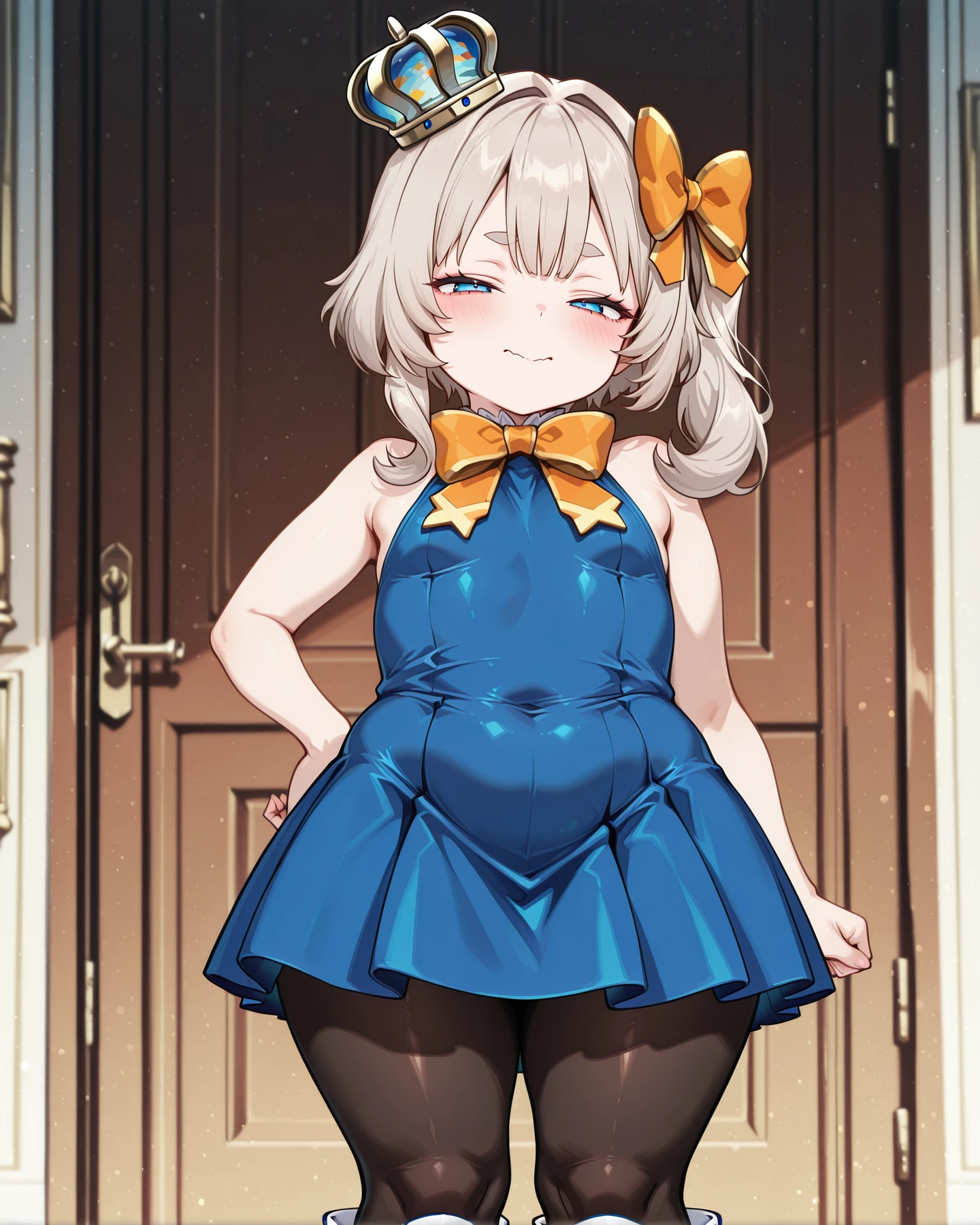 FishPrincess, blue eyes, platinum blonde hair, medium hair, side ponytail, orange bow, hair bow, mini crown, orange bowtie, blue sleeveless top, white layered dress, gold trim, bare shoulders, white corset, blue tailcoat, back ribbon, fish shaped orange sleeves, wide detached sleeves, black pantyhose, white boots, blue heel shoes,