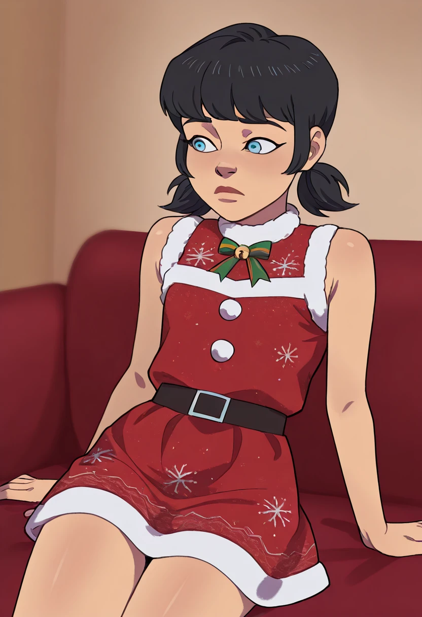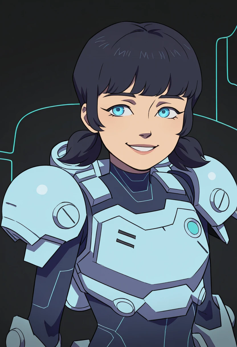 short dark hair, small side pigtails, straight bangs, blue eyes, light skin, grey chest armor plate, dark blue undersuit with subtle cyan lines, short sleeves, shorts over leggings,