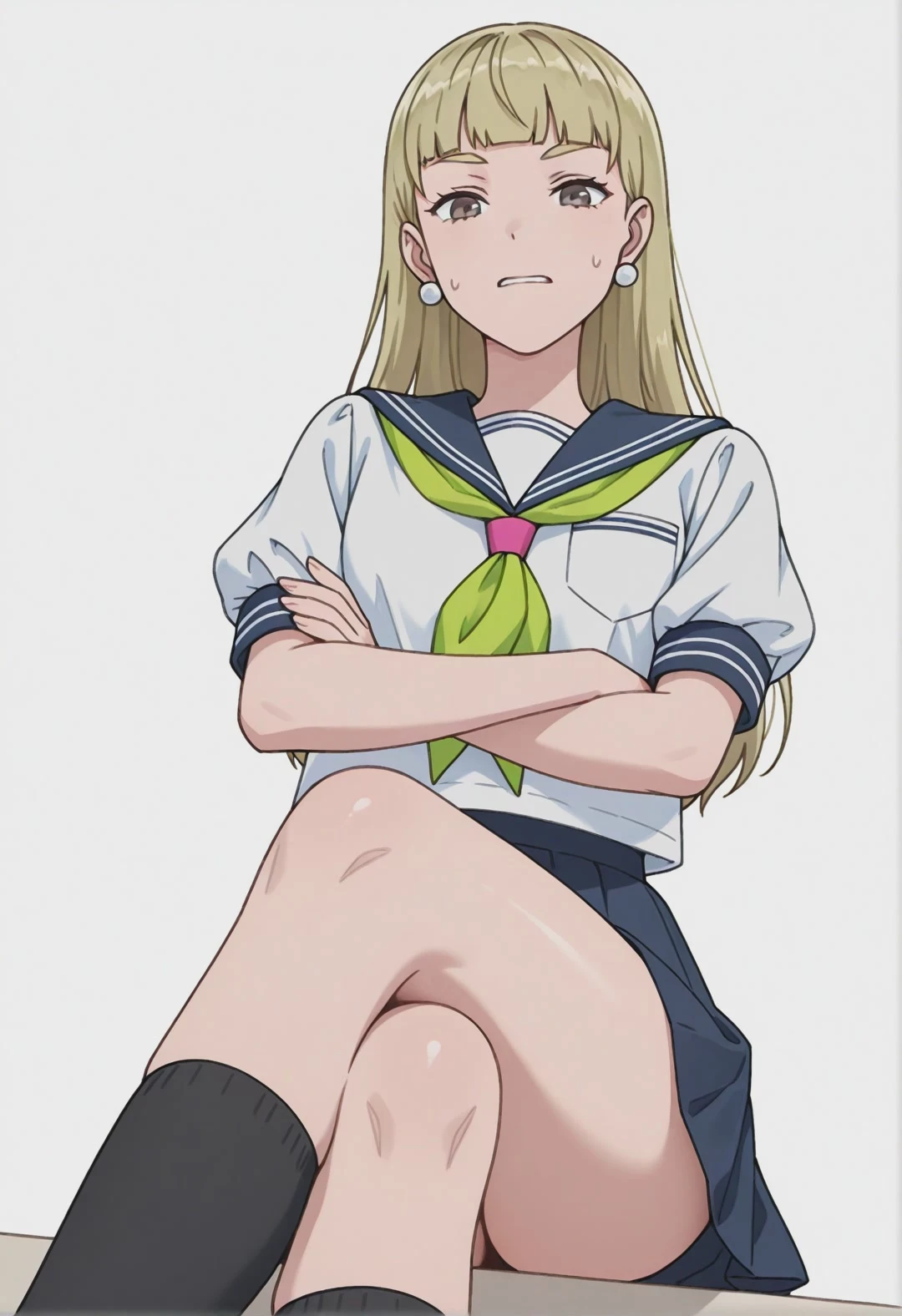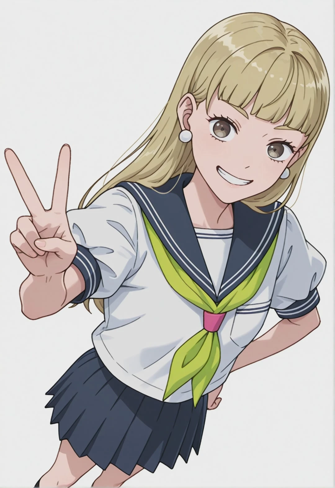 da7, long hair, blunt bangs, blonde hair, brown eyes, earrings,