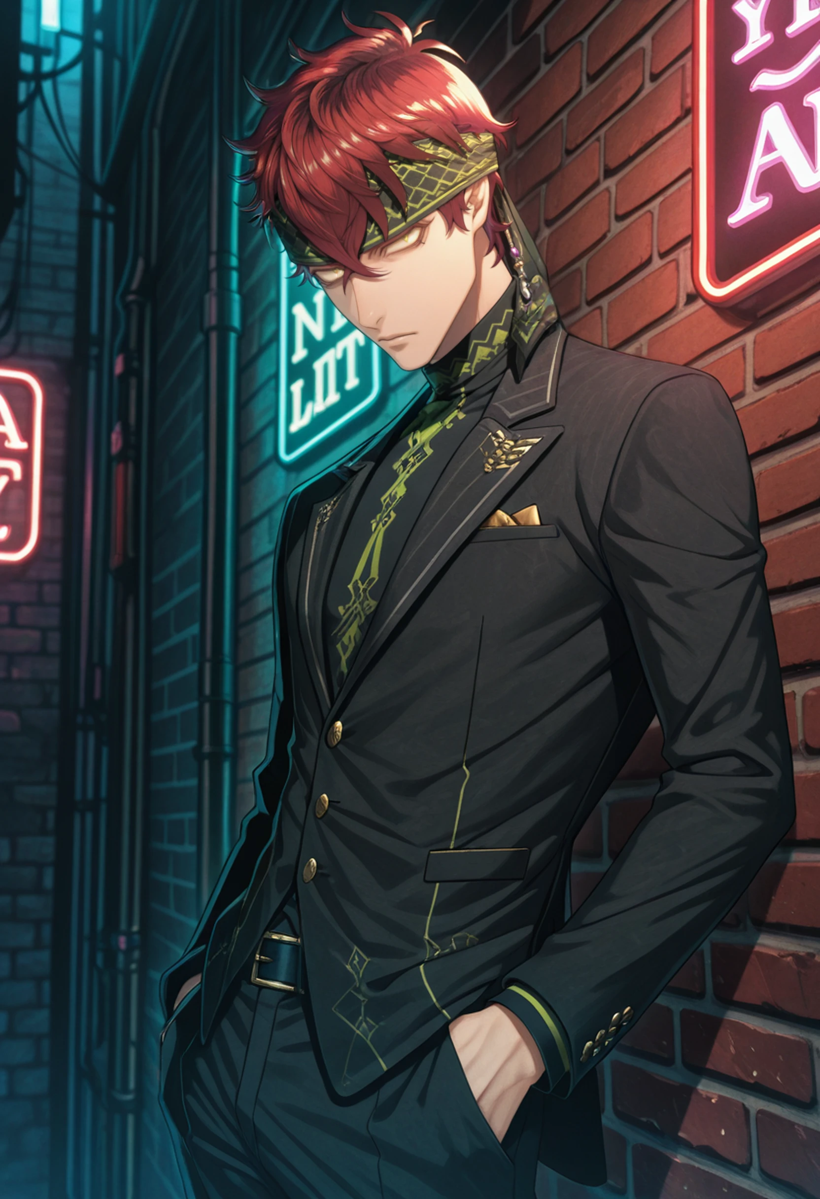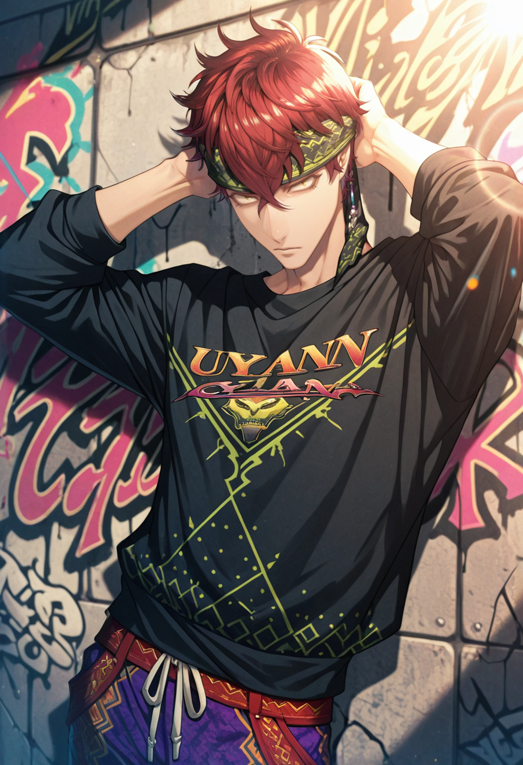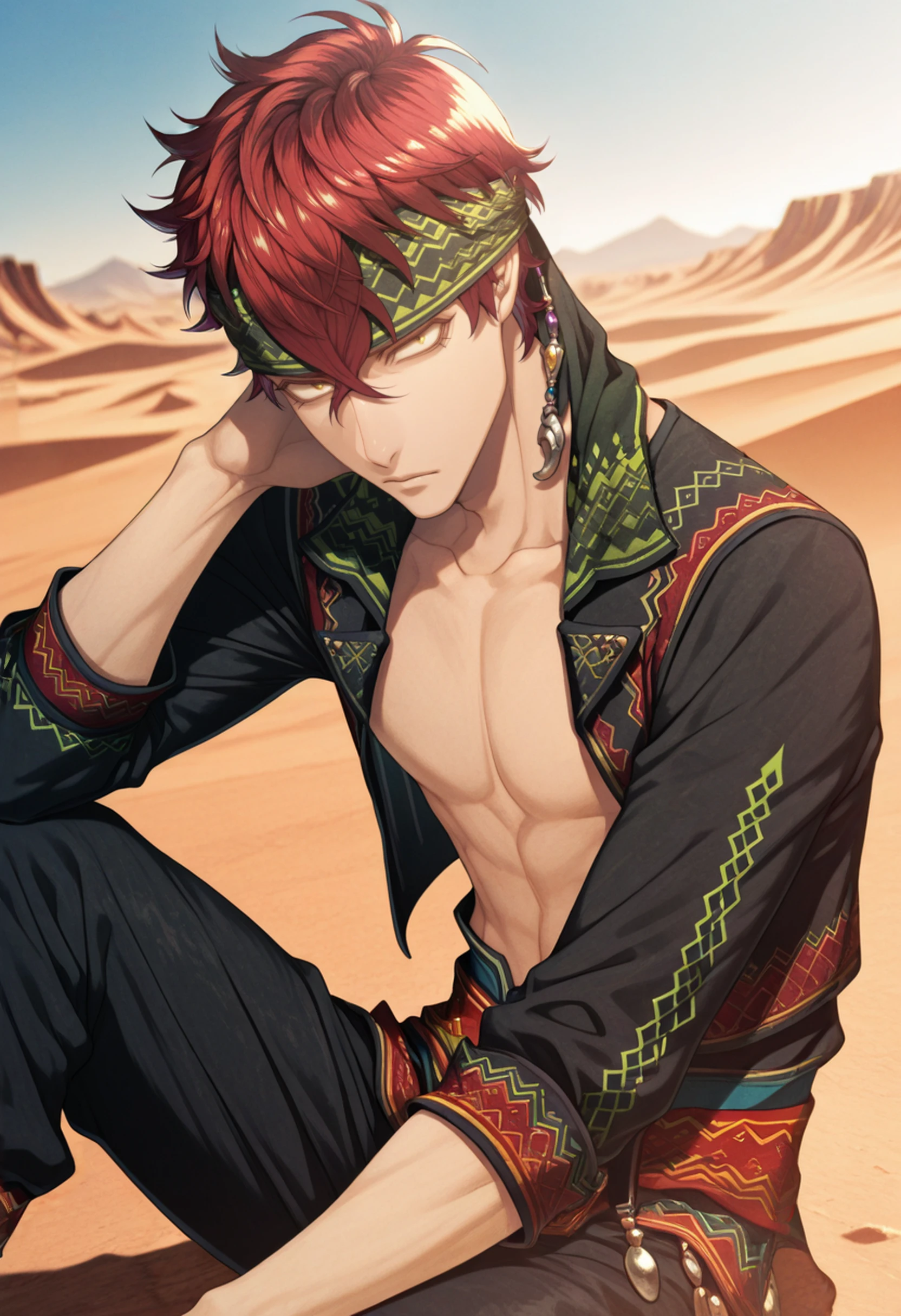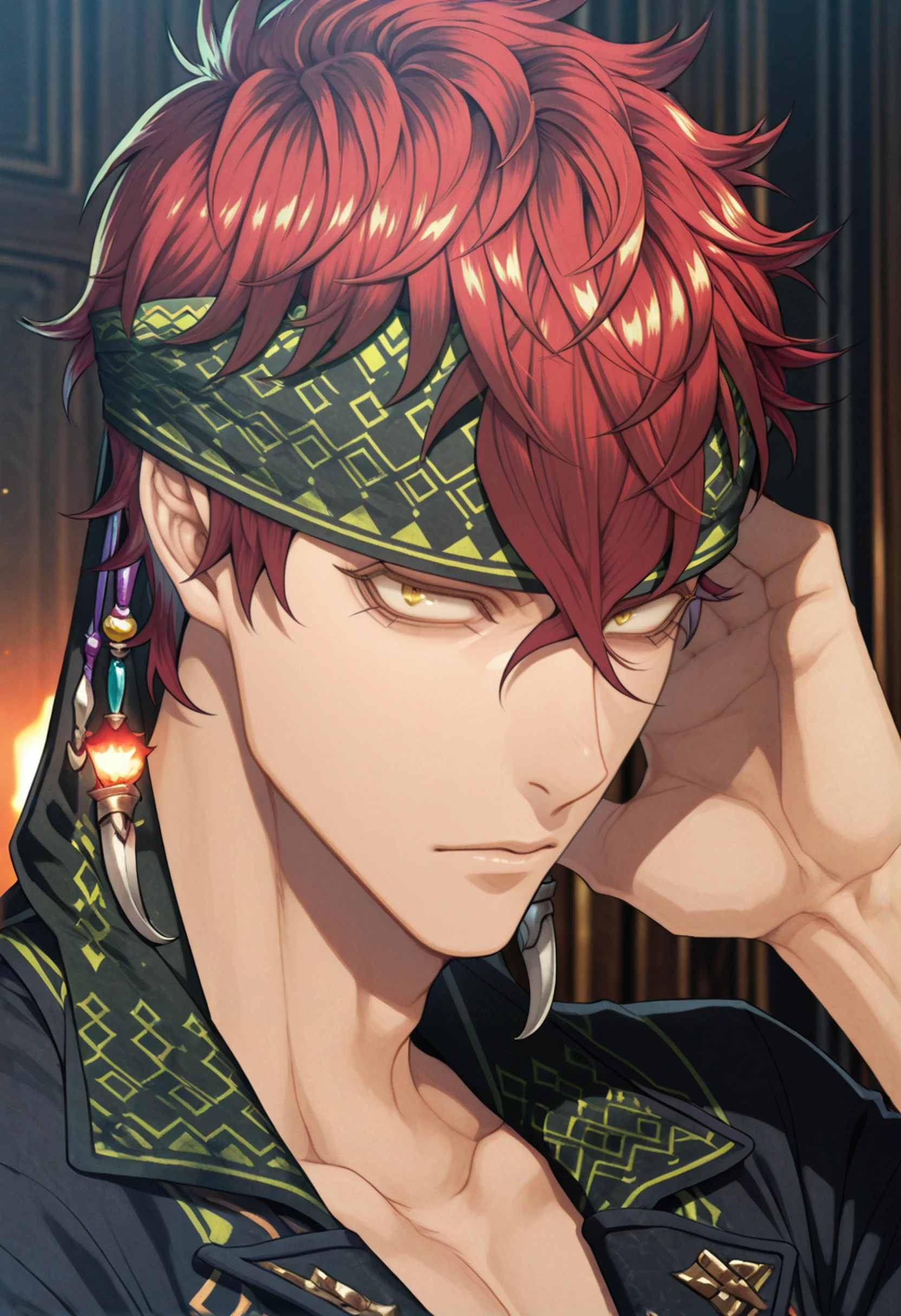 CEIgnis, 1boy, male focus, short hair, red hair, yellow eyes, green headband