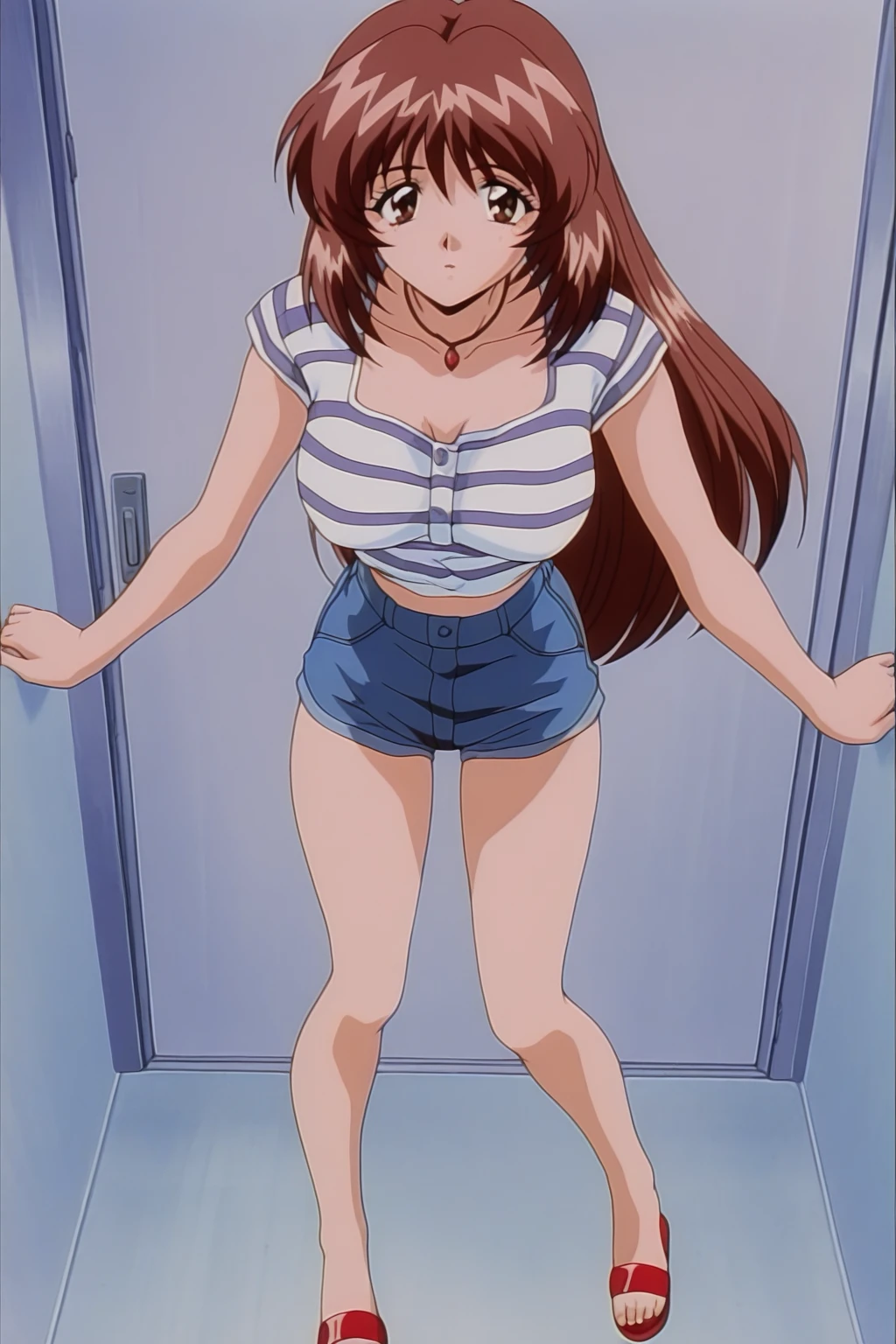 izyi Kiss yori...,asaoka chihiro,anime screencap,retro artstyle,1990s,1girl,solo,brown hair,long hair,brown eyes,large breasts,necklace,white wide-striped t-shirt,midriff,denim shorts,red platform sandals,