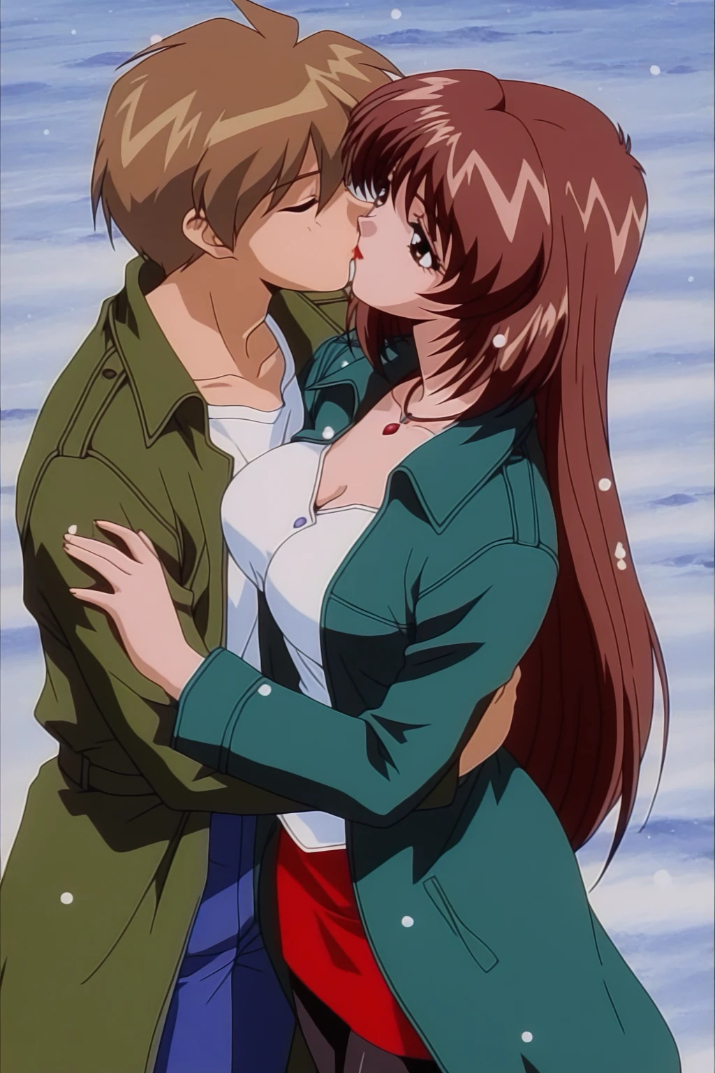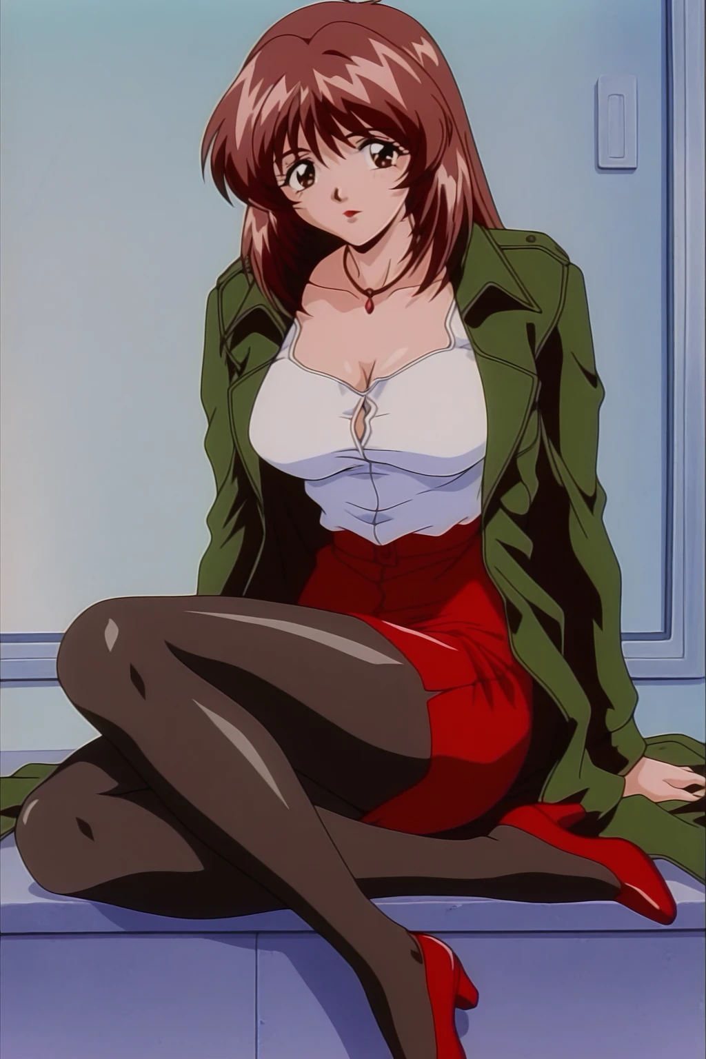 izyi Kiss yori...,asaoka chihiro,anime screencap,retro artstyle,1990s,1girl,solo facus,brown hair,long hair,brown eyes,red lips,large breasts,necklace,green trench coat,red suit,white plain blouse ,red pencil skirt,black pantyhose,red high heels,