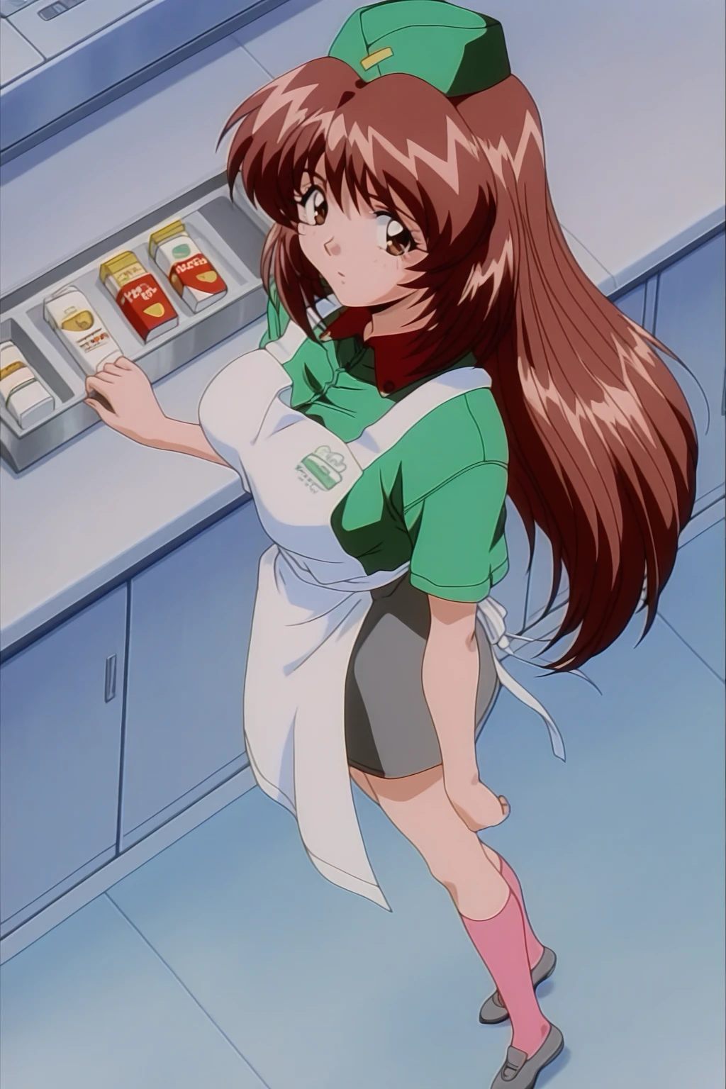 izyi Kiss yori...,asaoka chihiro,anime screencap,retro artstyle,1990s,1girl,solo,brown hair,long hair,brown eyes,large breasts,light-green fast-food worker cap,light-green fast-food worker uniform,white fast-food apron,grey skirt,pink kneehighs,grey shoes,