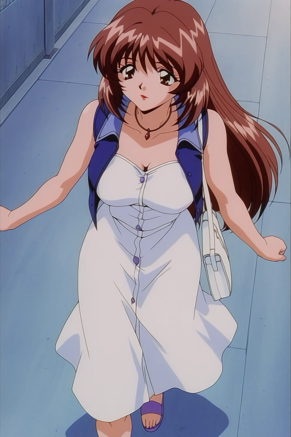 izyi Kiss yori...,asaoka chihiro,anime screencap,retro artstyle,1990s,1girl,solo,brown hair,long hair,brown eyes,red lips,large breasts,necklace,blue vest,white dress,light blue shoulder bag,white skirt,purple platform sandals,