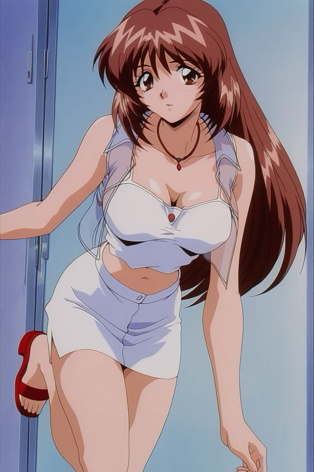 izyi Kiss yori...,asaoka chihiro,anime screencap,retro artstyle,1990s,1girl,solo,brown hair,long hair,brown eyes,large breasts,necklace,transparent vest,white cropped camisole top,midriff,white skirt,red platform sandals,