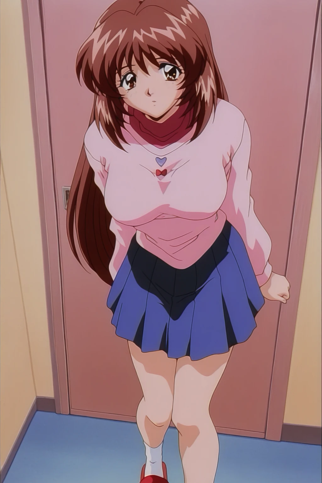 izyi Kiss yori...,asaoka chihiro,anime screencap,retro artstyle,1990s,1girl,solo,brown hair,long hair,brown eyes,large breasts,pink sweater,blue pleated skirt,white socks,red slippers,