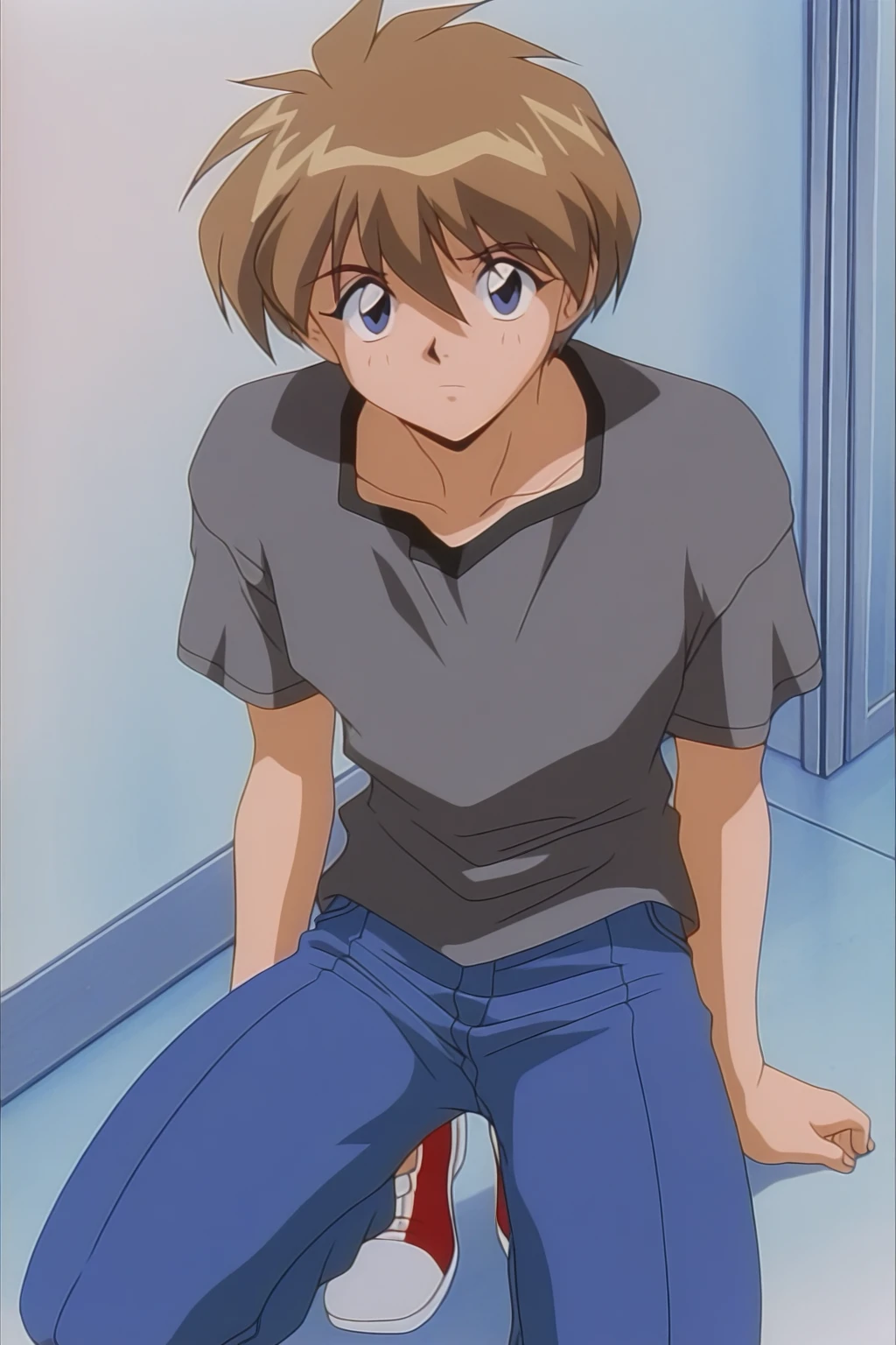 izyi Kiss yori...,Fukuroi Masato,anime screencap,retro artstyle,1990s,1boy,solo,brown hair,short hair,blue eyes,grey t-shirt,blue pants,red casual shoes,