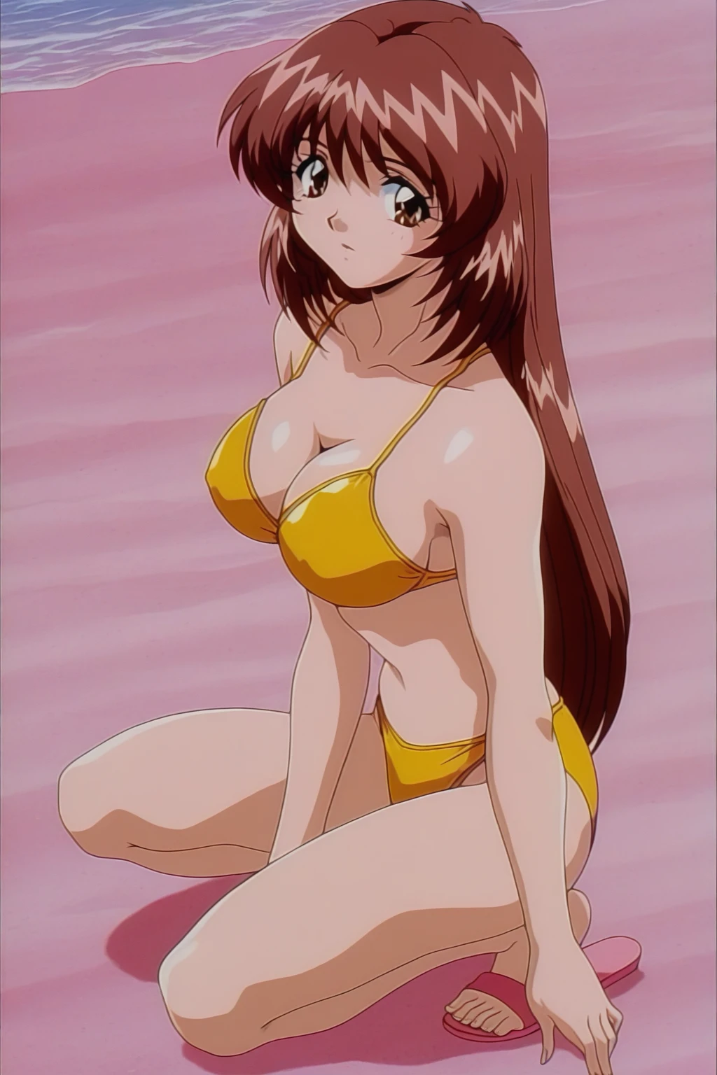 izyi Kiss yori...,asaoka chihiro,anime screencap,retro artstyle,1990s,1girl,solo,brown hair,long hair,brown eyes,large breasts,yellow bikini,pink beach sandals,