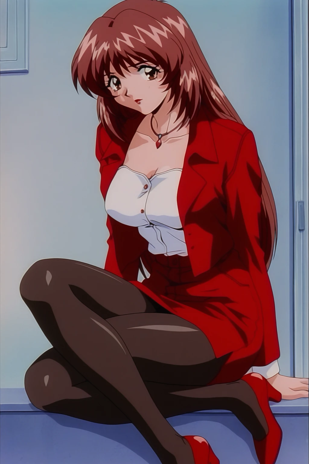 izyi Kiss yori...,asaoka chihiro,anime screencap,retro artstyle,1990s,1girl,solo facus,brown hair,long hair,brown eyes,red lips,large breasts,necklace,red suit,white plain blouse ,red pencil skirt,black pantyhose,red high heels,
