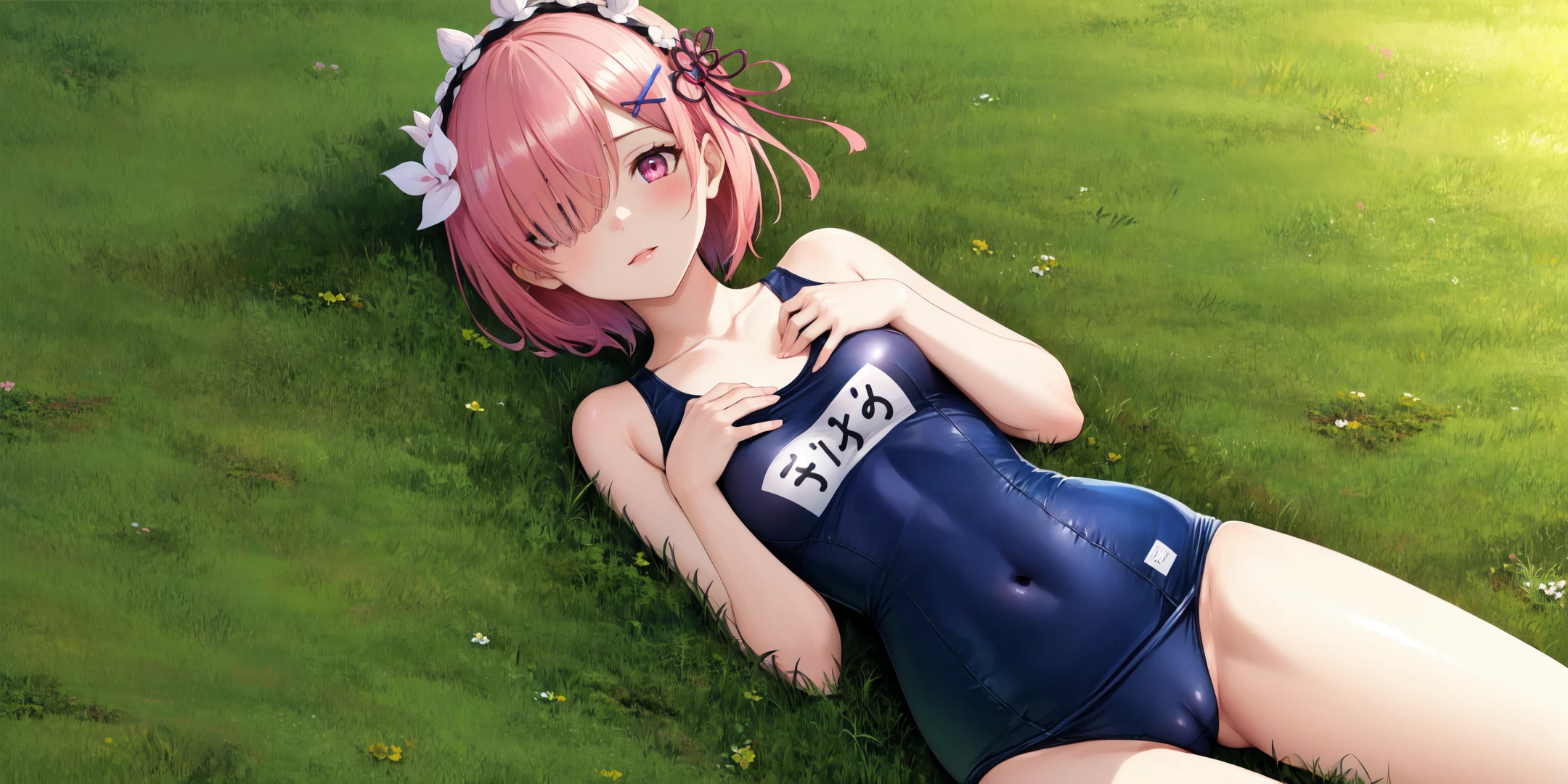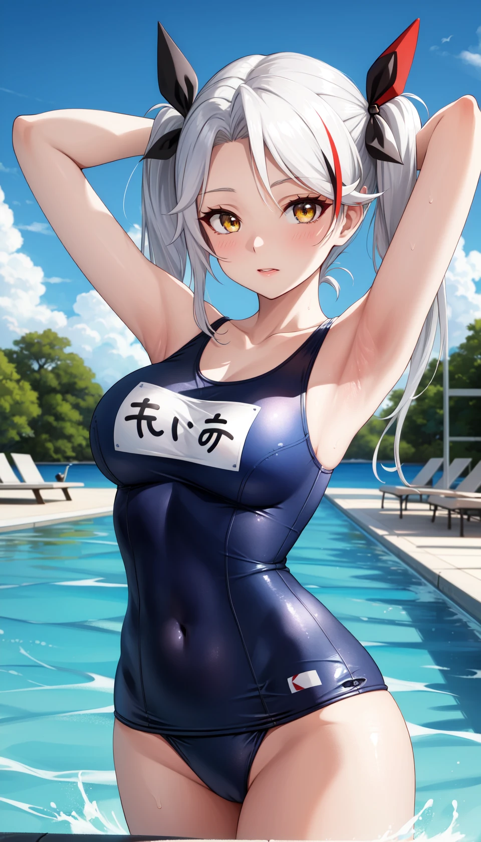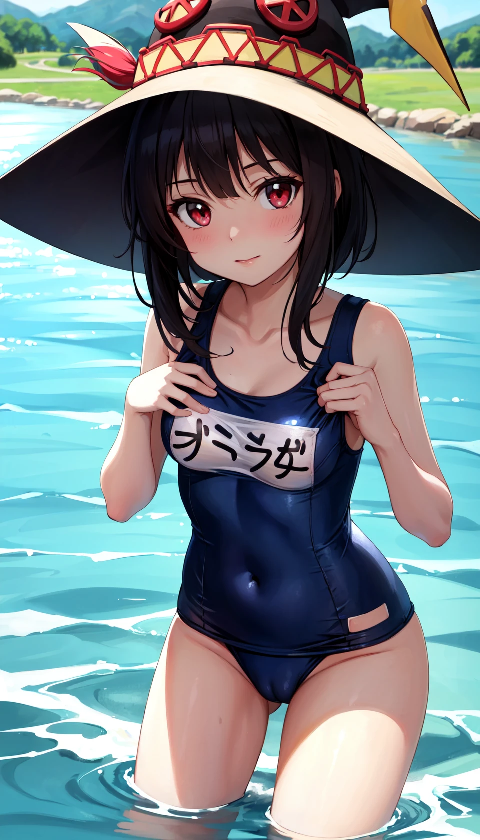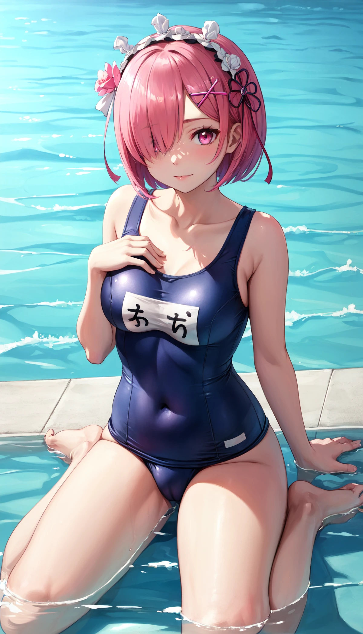 swimsuit, one-piece swimsuit, school swimsuit, old school swimsuit, covered navel, collarbone, blue one-piece swimsuit, name tag;