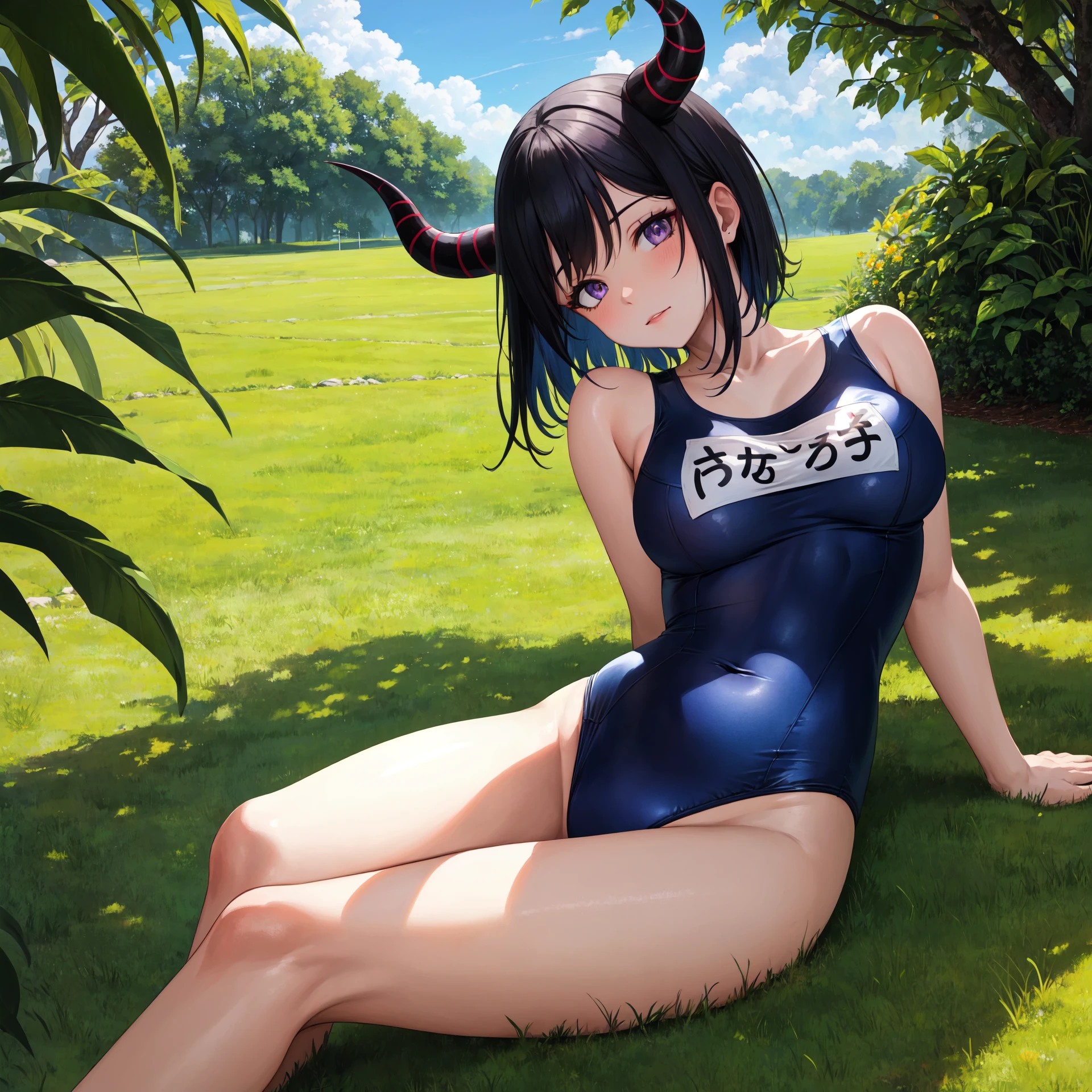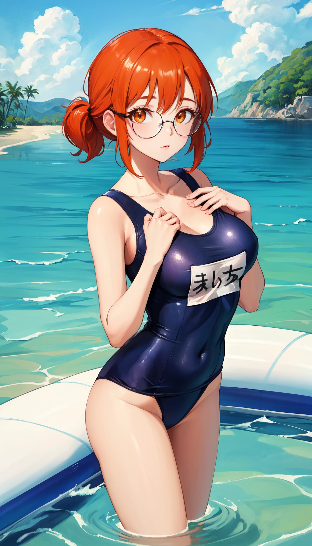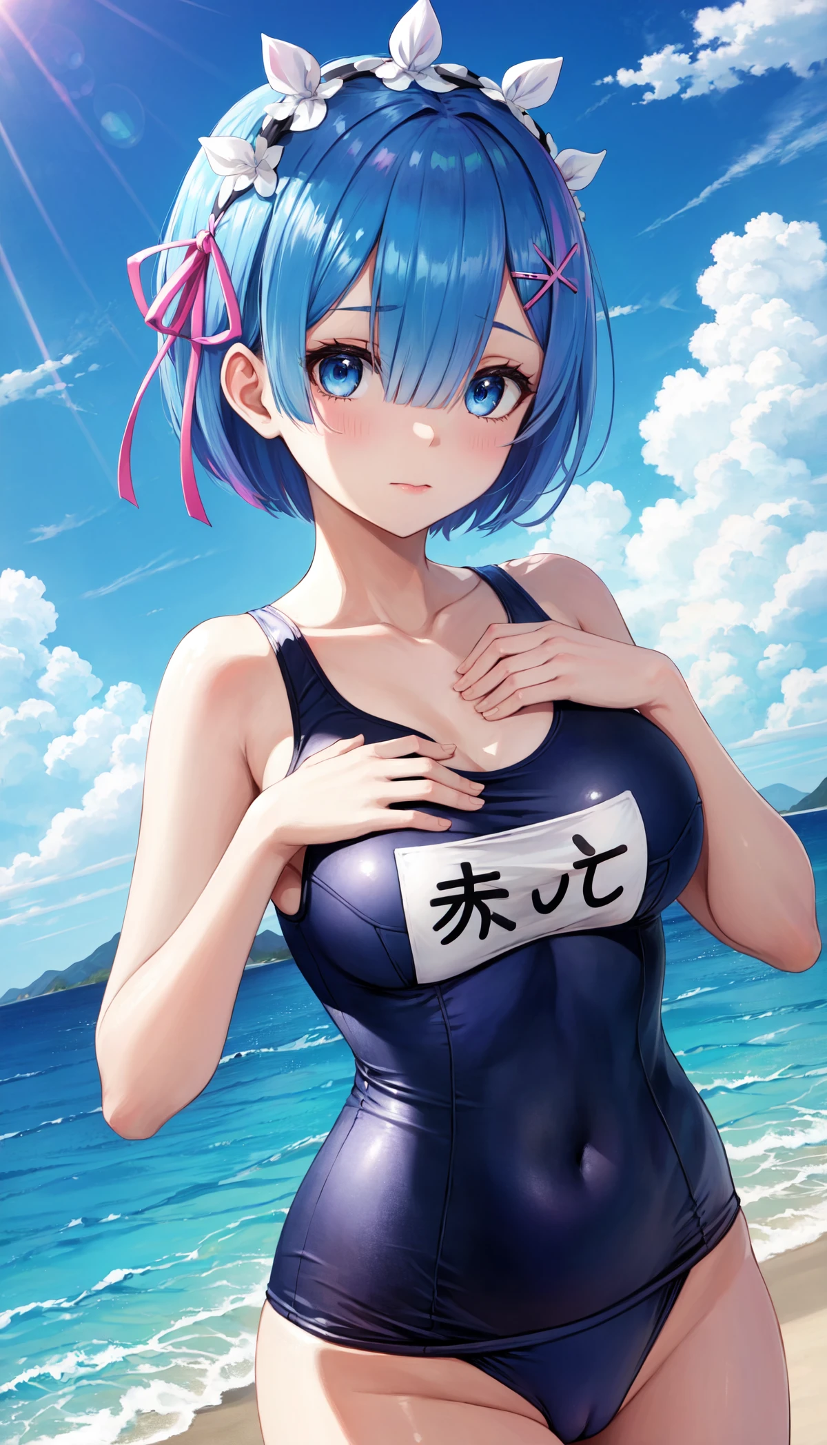 swimsuit, one-piece swimsuit, school swimsuit, old school swimsuit, covered navel, collarbone, blue one-piece swimsuit, name tag,