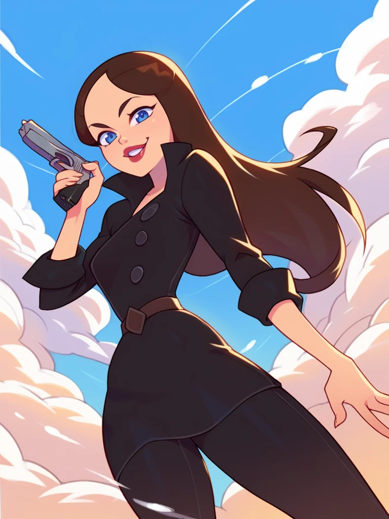 BASE Outfit: "brown hair, long hair, blue eyes, lipstick, black coat, belt, black pants"
