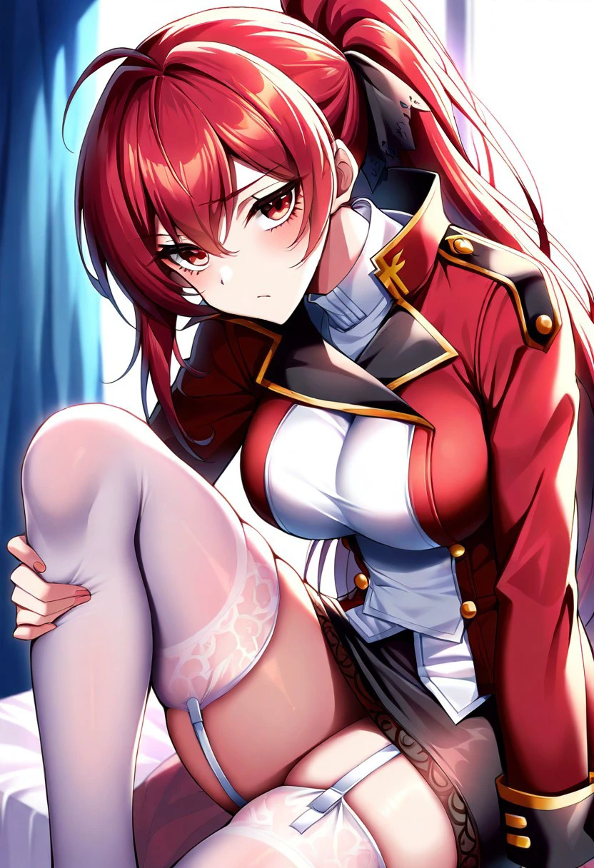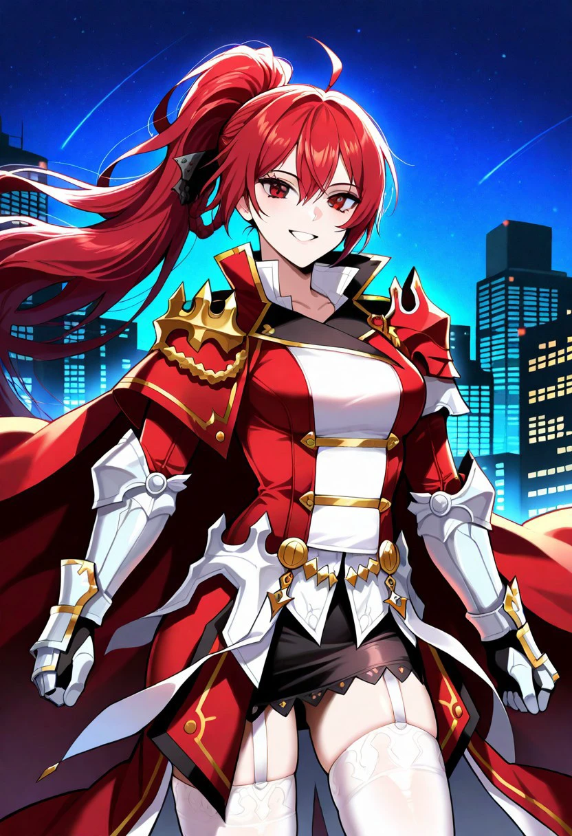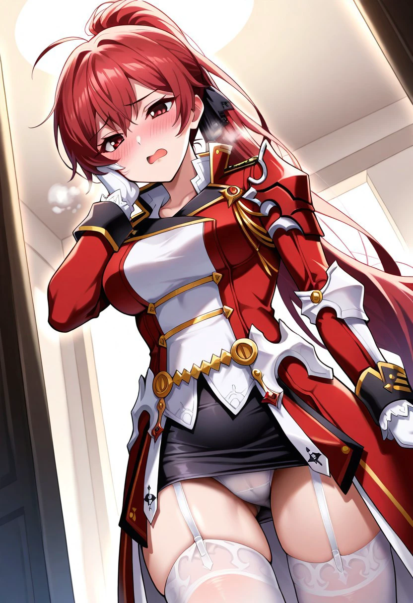 Outfit: red and white military uniform, double breasted jacket, shoulderguards, black miniskirt, pencil skirt, metal greaves, metal gauntlets, cape, white thighhigh, garterbelt
