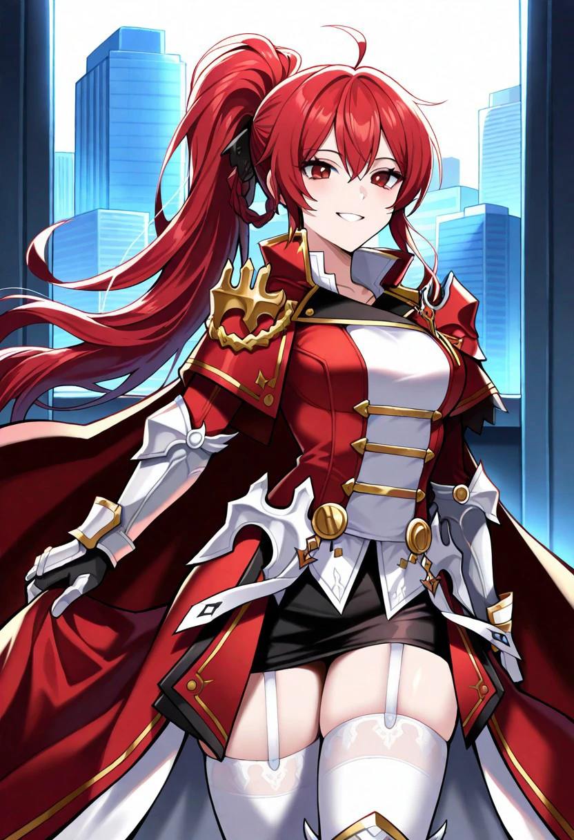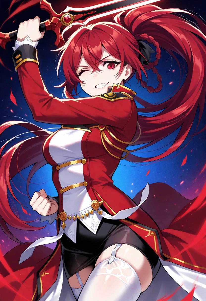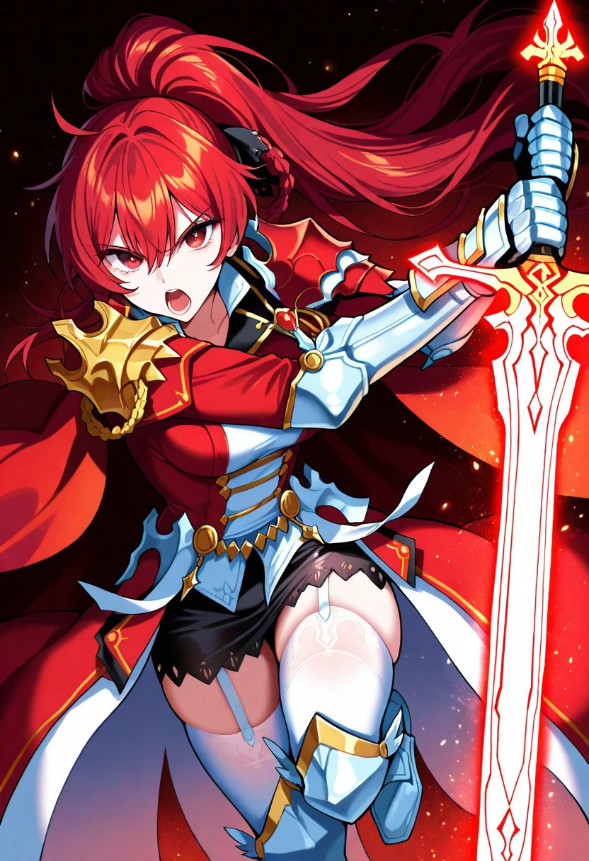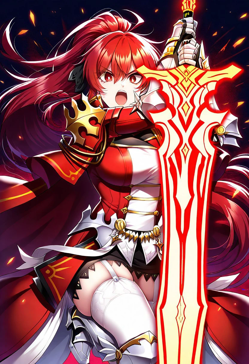 Trigger: solo, 1girl, elesisEmpSord, ponytail, red hair, red eyes