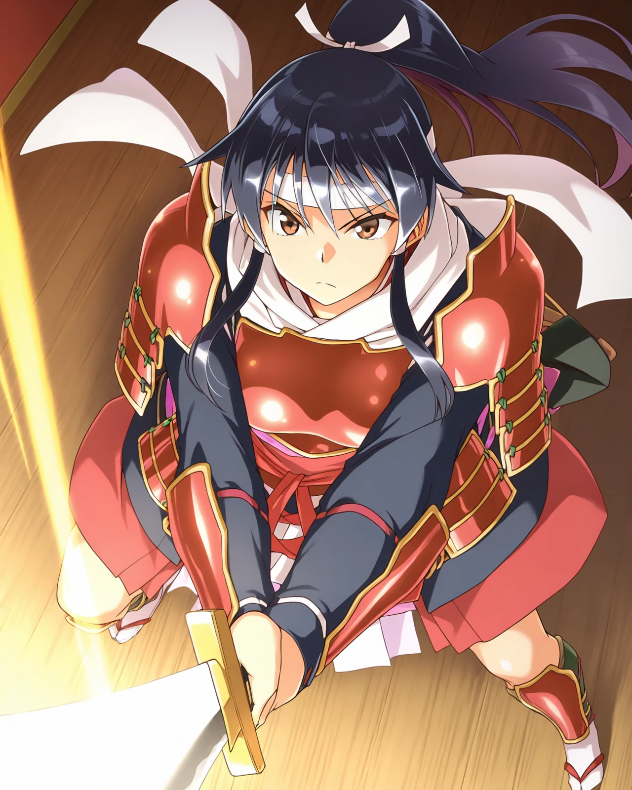 ShionFemmeFatale, 1girl, long hair, black hair, red eyes, brown eyes, ponytail, sidelocks, armor, headband, holding sword, katana, shoulder armor, white ribbon, sheath, sheathed, breastplate, japanese armor, faulds, sode, kote, white headband, samurai, red armor, kusazuri, gloves, high ponytail, greaves, tabi,
