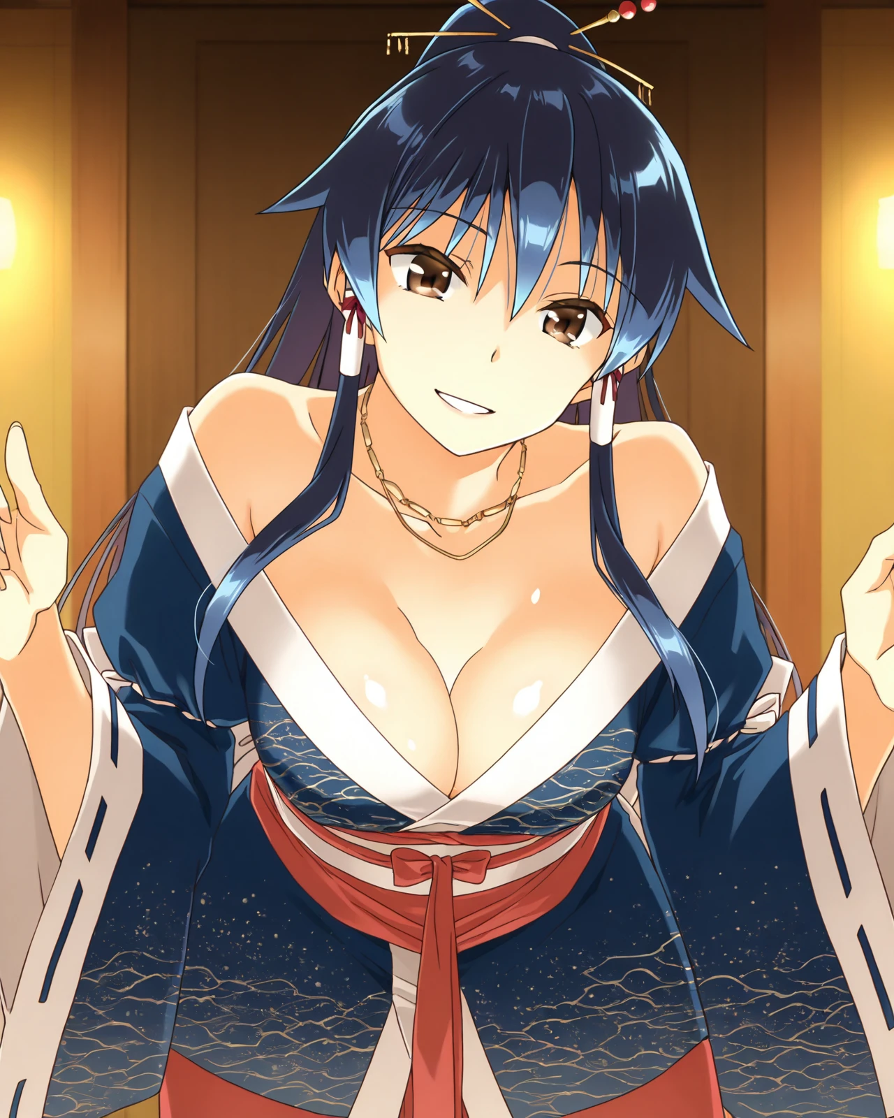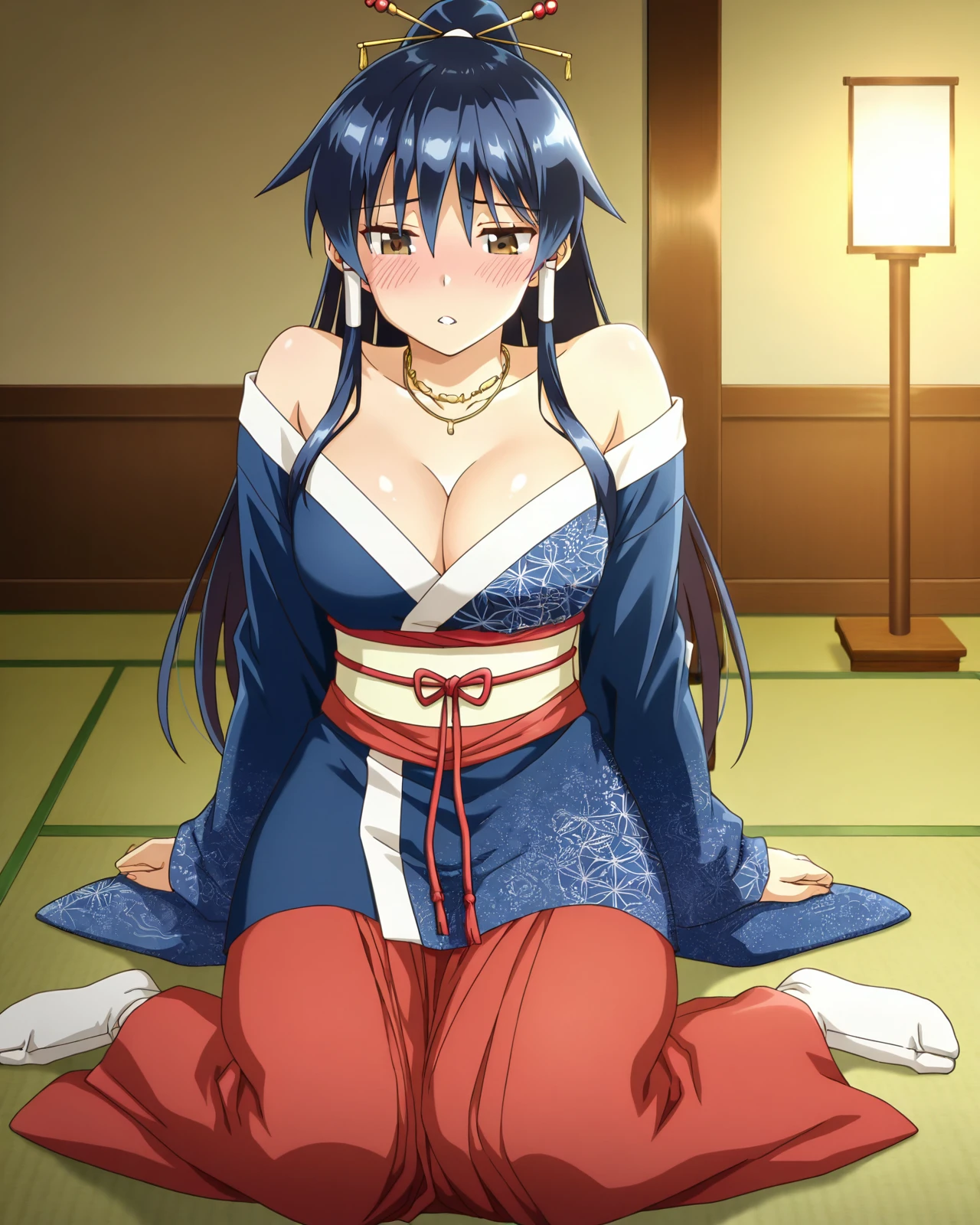ShionFemmeFatale, 1girl, long hair, blush, large breasts, brown eyes, black hair, long sleeves, hair ornament, hair between eyes, cleavage, jewelry, bare shoulders, blue hair, ponytail, sidelocks, parted lips, japanese clothes, wide sleeves, necklace, obi, hair tubes, blue kimono, hair stick, high ponytail, sash, red long skirt, long dress, white socks, tabi,