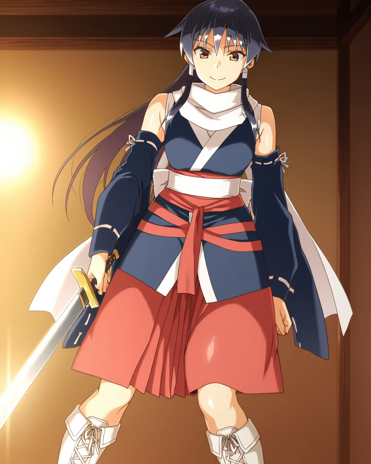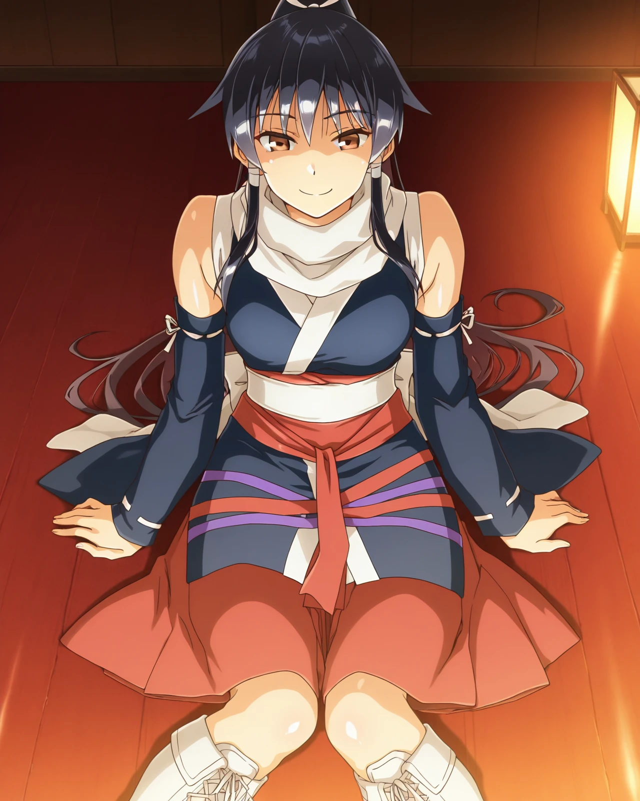ShionFemmeFatale, 1girl, red eyes, brown eyes, long hair, skirt, black hair, bare shoulders, ponytail, detached sleeves, japanese clothes, elbow gloves, scarf, sash, white footwear, knee boots, hakama, hakama skirt, cross-laced footwear, white scarf, lace-up boots,