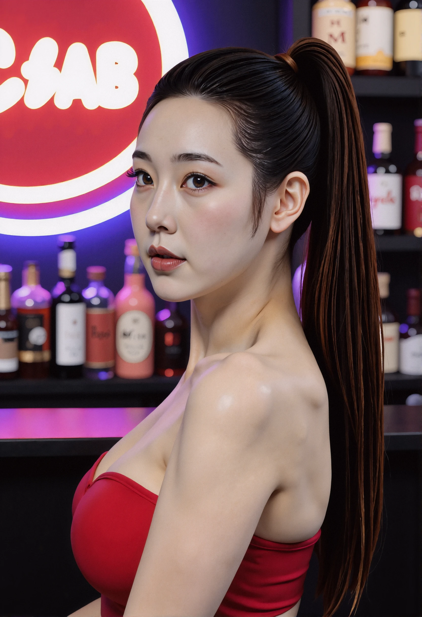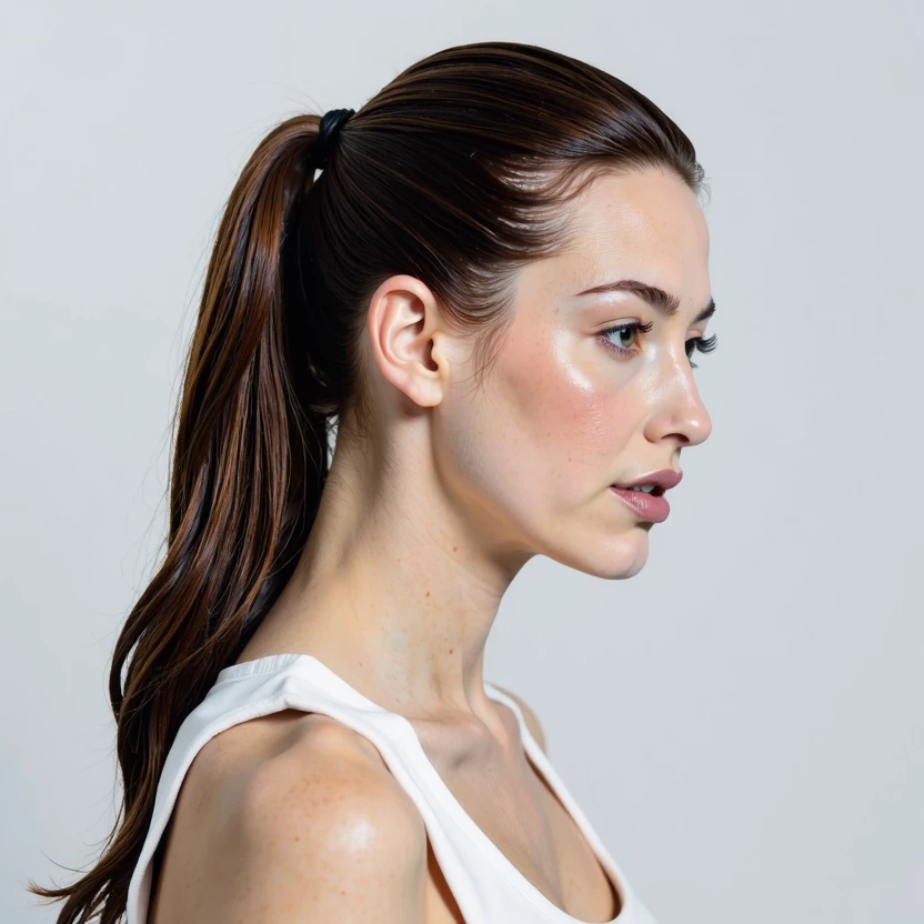 slicked back hairstyle:1.2, high ponytail:1.3, pulled back hairstyle:1.2