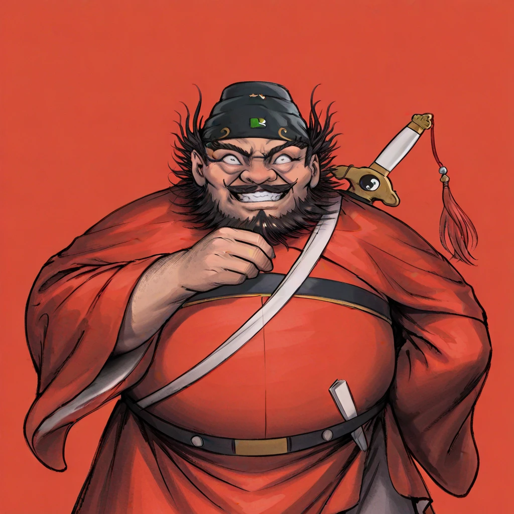1boy, male focus, facial hair, solo, weapon, beard, sword, hat, mustache, fat, black hair, black headwear, fat man, long sleeves, chinese clothes, wide sleeves, jogyu