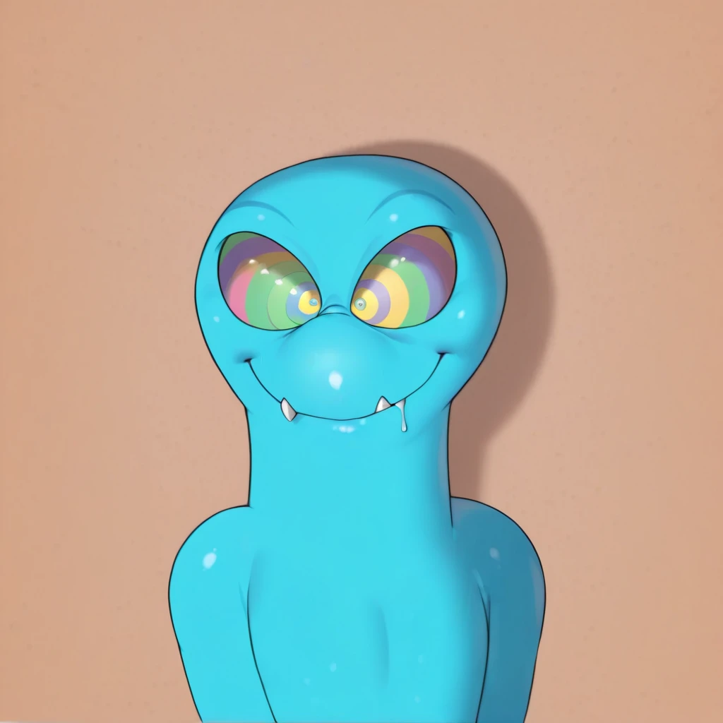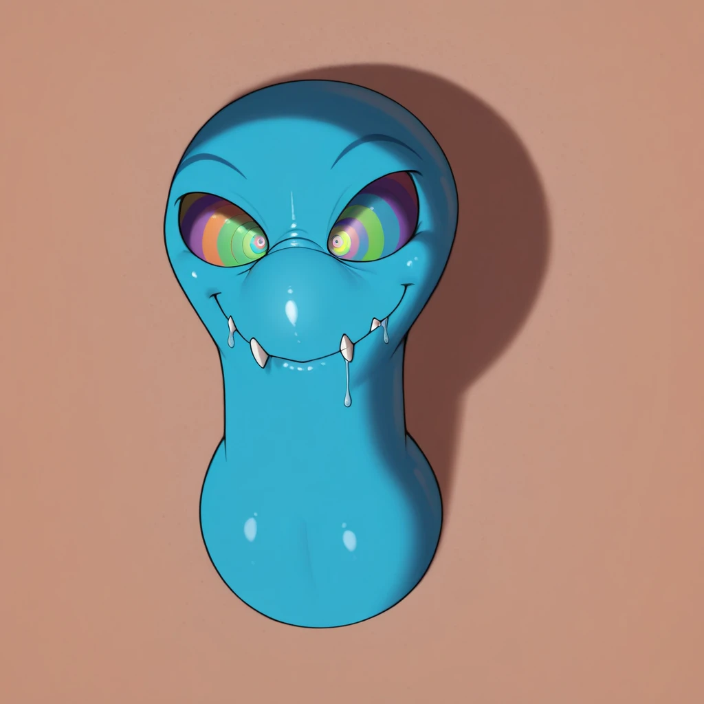 masterpiece, multicolored eyes, <lora:Spiralwash_eyes_IL_V7:1> (kaa eyes:1.2), best quality, arms dangling, looking up, eyeroll, drool, goofy smile, kaa eyes, identical blue model, identical background, closed mouth,1boy, solo, disney 2D