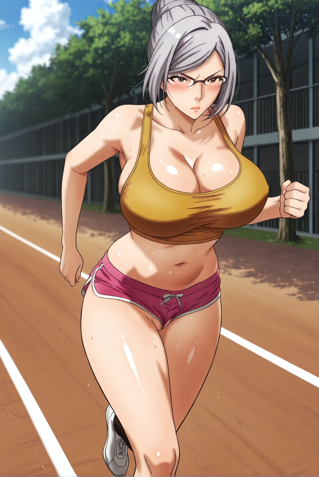 Shiraki Meiko, grey hair, hair bun, brown eyes, huge breasts