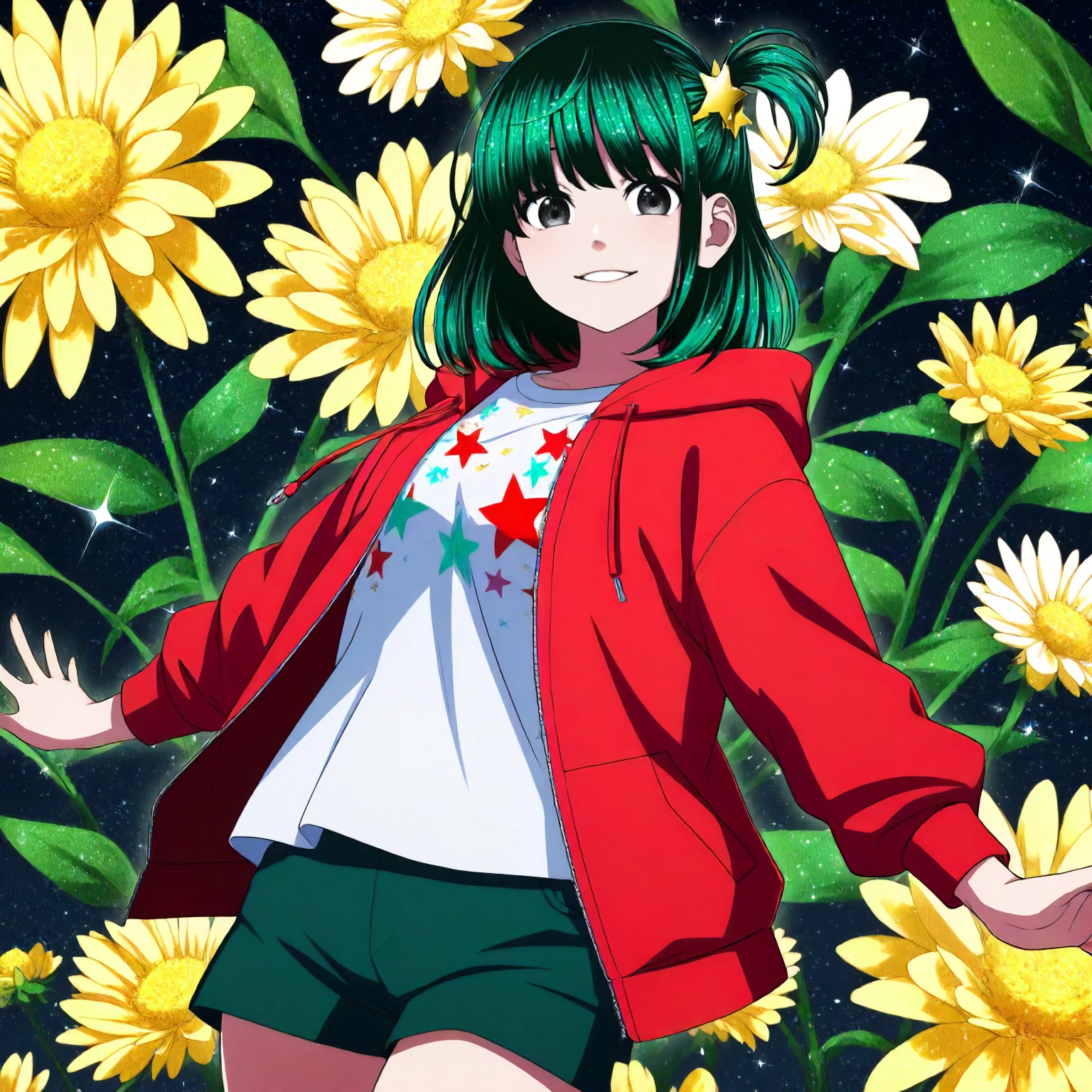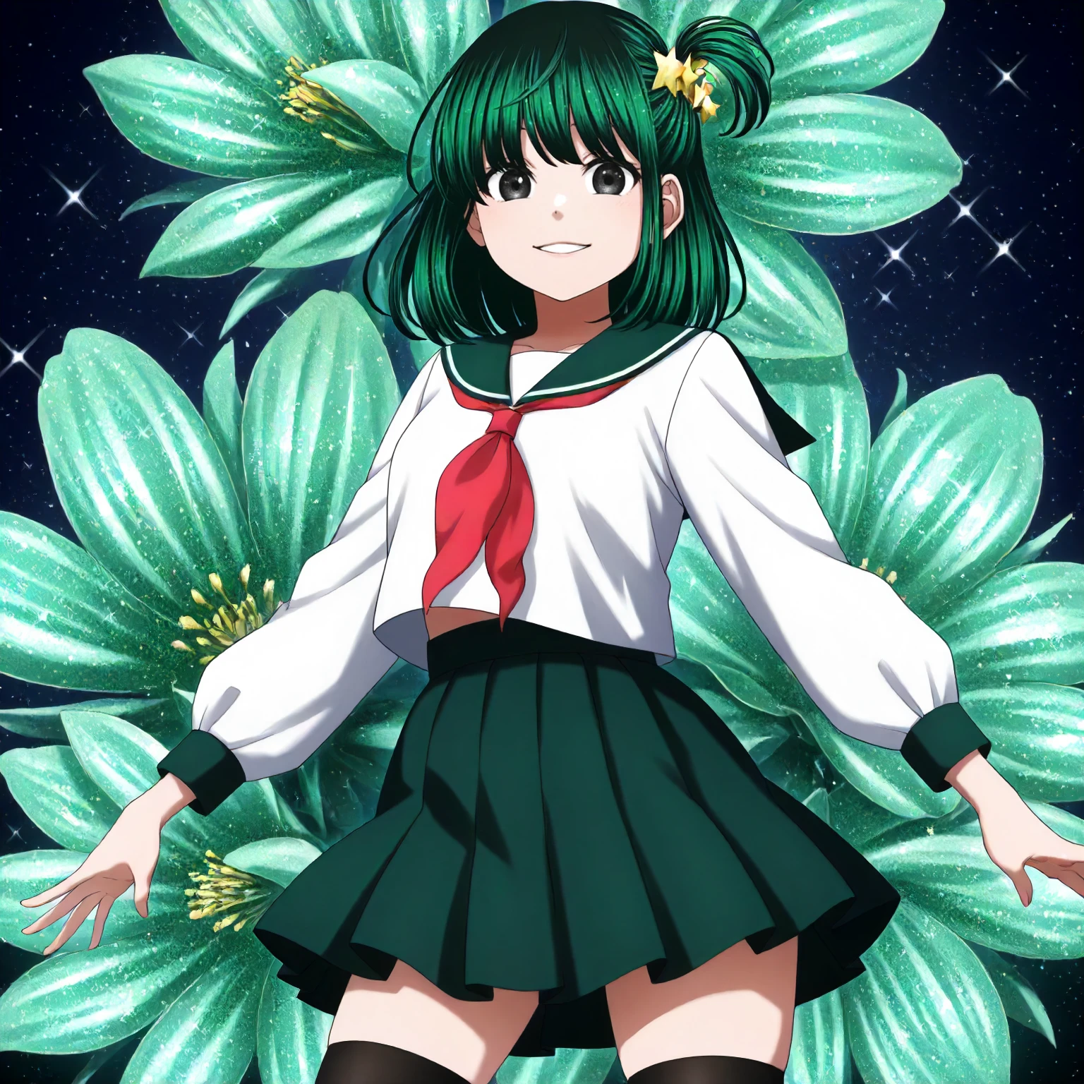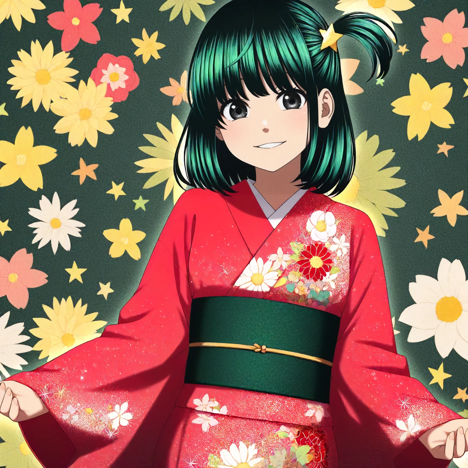 anime coloring, machiya_kana\(dead_tube\),1girl,black green hair,medium hair,one side up,star_hair_ornament,black eyes,