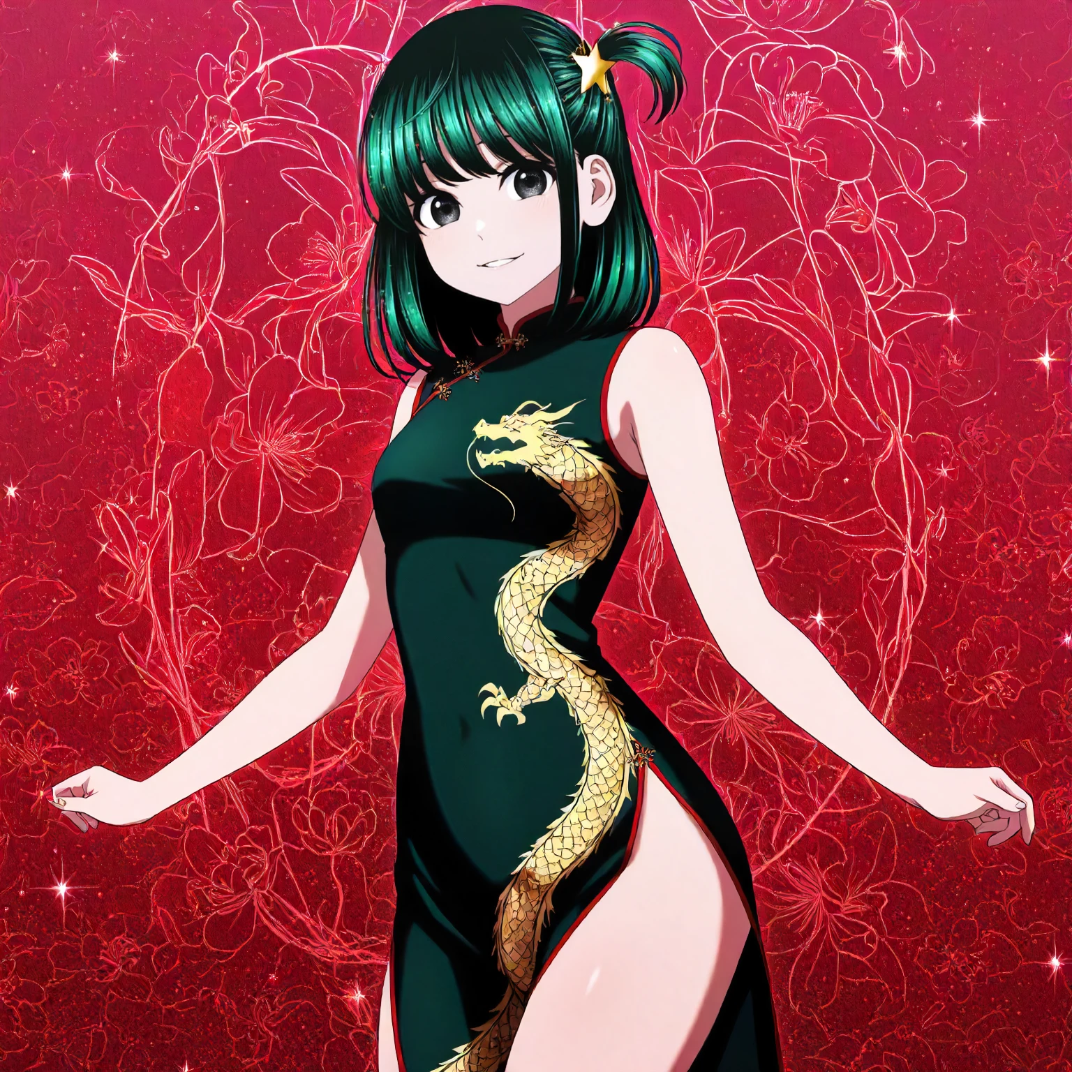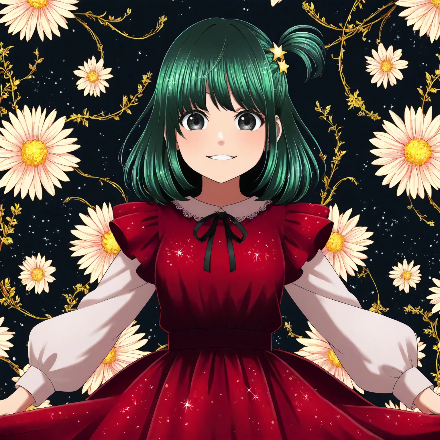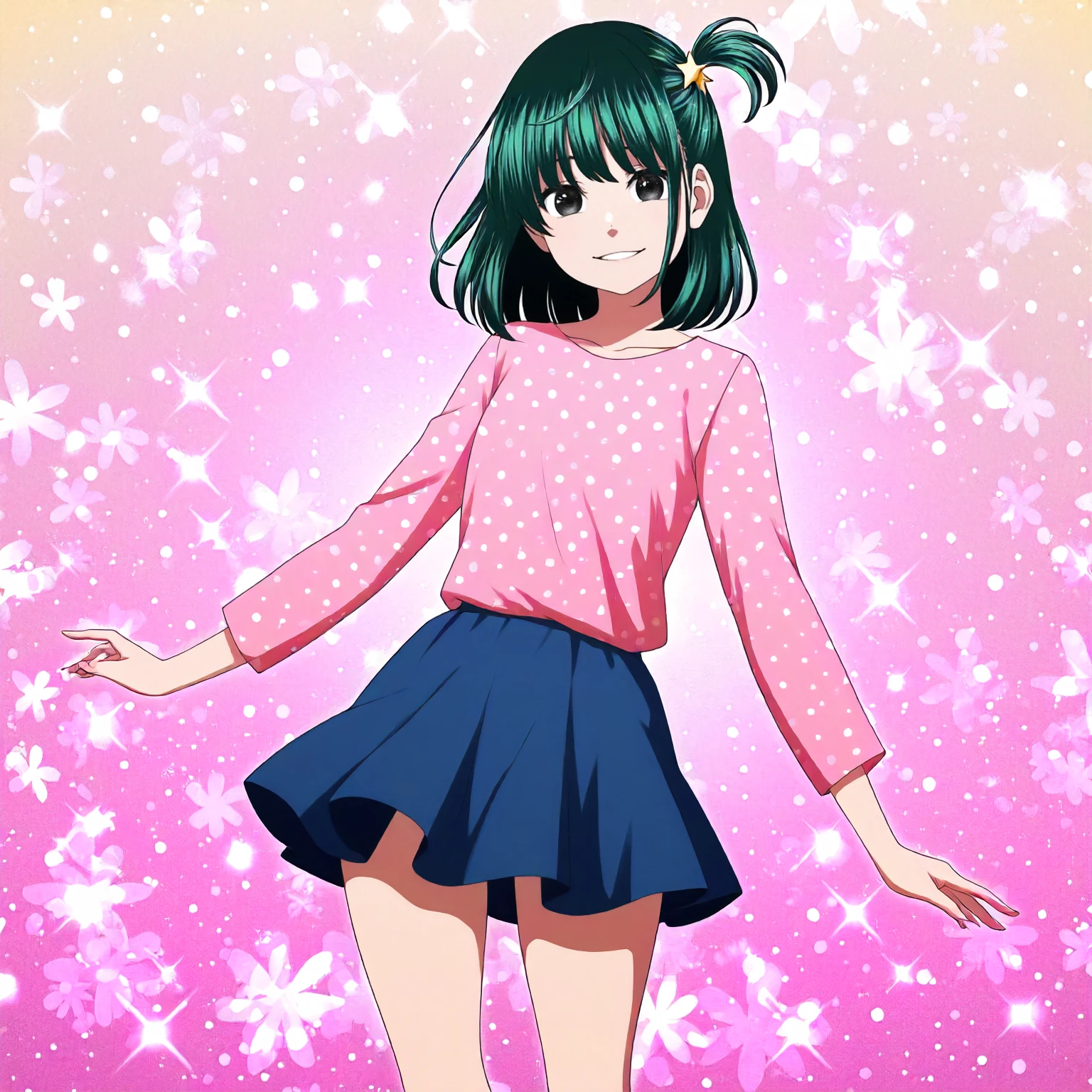anime coloring, machiya_kana\(dead_tube\),1girl,black green hair,medium hair,one side up,star_hair_ornament,black eyes,
