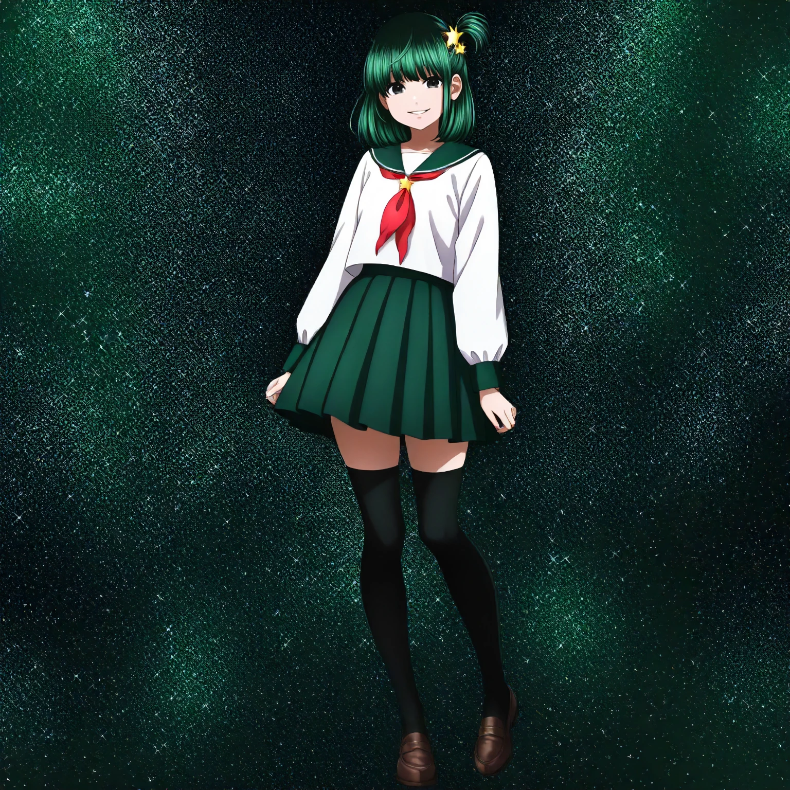 green sailor collar,red_neckerchief,white shirt,long_sleeves, black green skirt, black green_thighhighs,