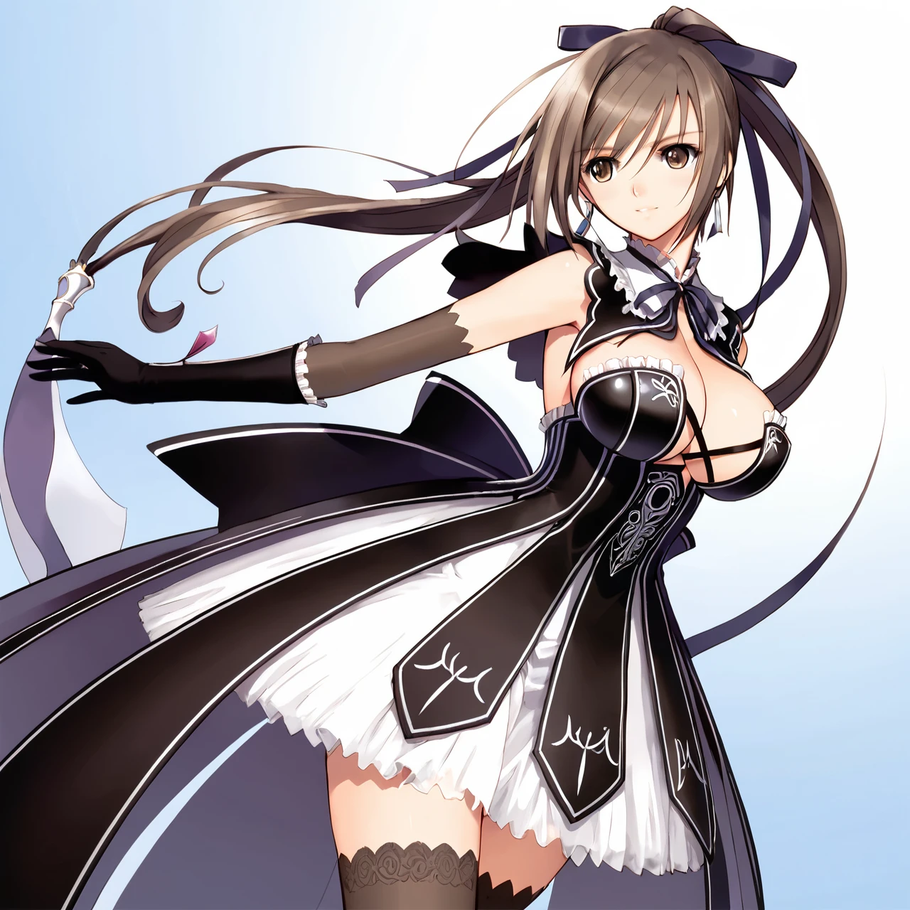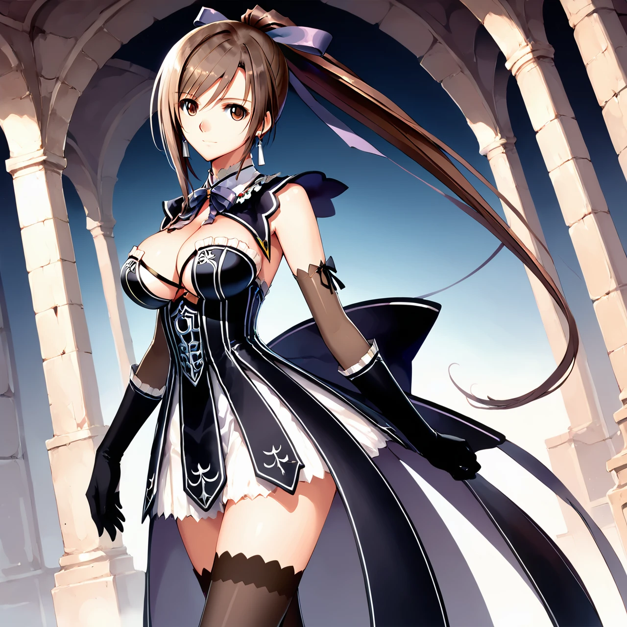 sakuya,gloves,breasts,elbow gloves,long hair,thighhighs,brown eyes,earrings,cleavage,large breasts,ponytail,brown hair,jewelry,black gloves,dress,black thighhighs,bow,ribbon,detached collar,