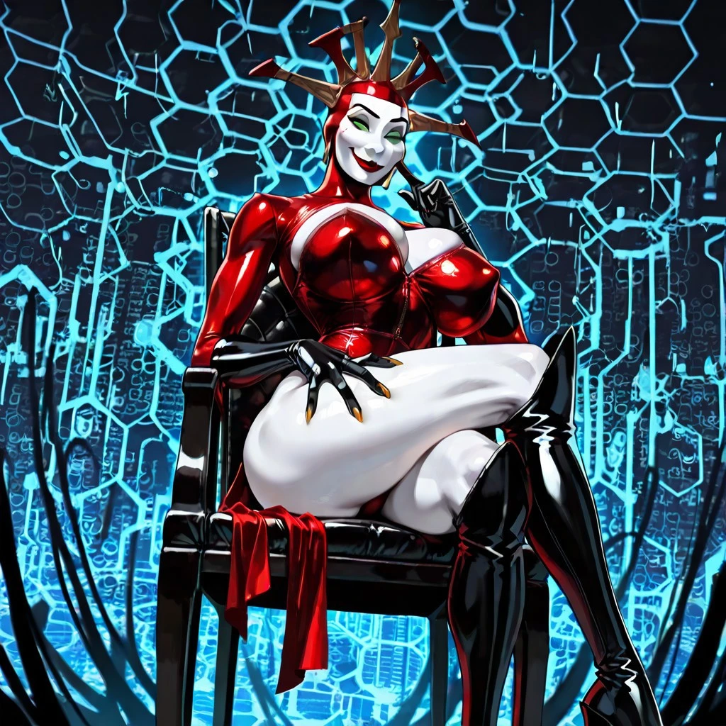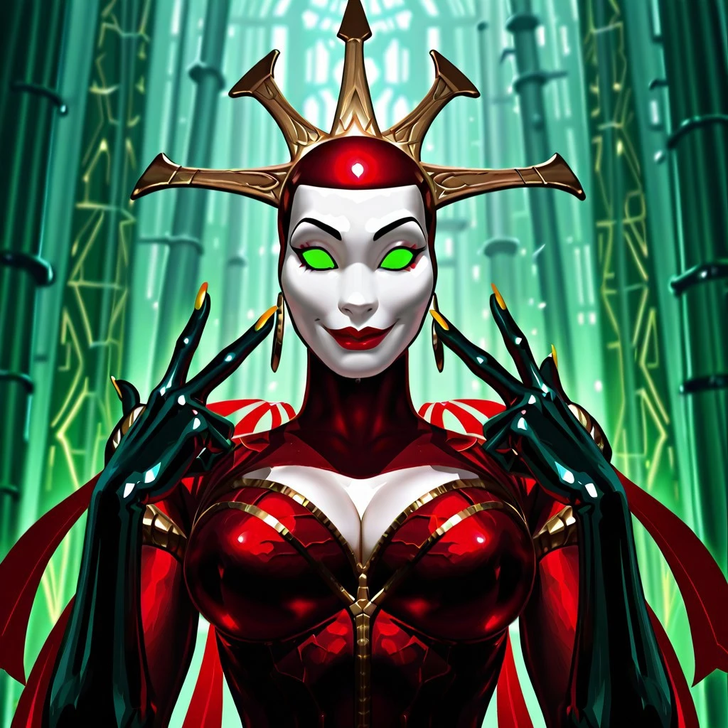 monster female, solo, curvy, breasts, red with coif, five point crown, black opera gloves, thigh-high black boots, long yellow nails, red ribbon mantle, red lips, wicked smile, closed lips, white mask face, single color green eyes,